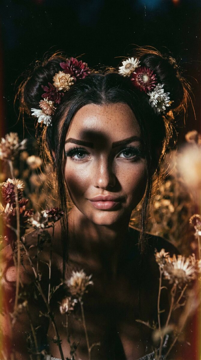 Загорелая красивая девушка с длинными волосами, собранными в два небрежных пучка, вплетены сухие полевые цветы. Оттенки марсала, тёплый беж, молочно-белые акценты. Эстетика 90-х. Пухлые губы с лёгкой естественной улыбкой, крупные выразительные серые глаза, длинные густые ресницы. Натуральная текстура кожи и волос, живая кожа, высокая реалистичность, мягкое свечение. Крупный портретный план, лицо занимает большую часть кадра, фон размыт, сухие цветы частично перекрывают передний план. Мягкий кинематографичный свет с одной стороны, глубокие тени, контраст между светом и темнотой. Камера с эффектом плёночной съёмки, 85mm, малая глубина резкости. Эффект съёмки на старую просроченную плёнку Fujifilm Superia 400, винтажная ретро атмосфера, лёгкое зерно, мягкий цветовой сдвиг, немного выцветшие и нестабильные оттенки, аналоговый шум, imperfect film look.