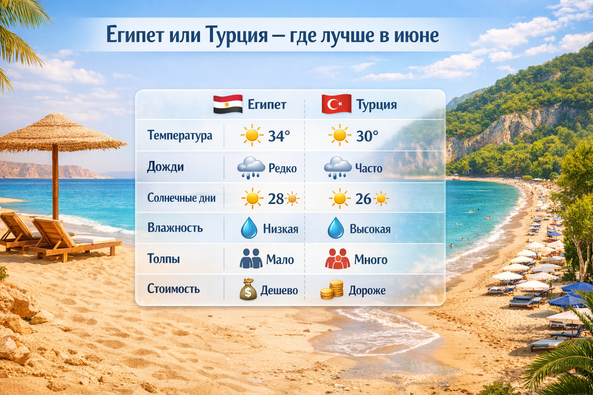 Лично для меня главный критерий — не цифры, а ощущение отпуска. В Египте в июне: В Турции: Есть ещё один момент, который многие недооценивают — влажность. На турецком побережье летом она выше, чем в Египте. Даже в июне это уже ощущается: примерно 55–65% влажности, и из-за этого жара воспринимается сильнее, чем есть на самом деле