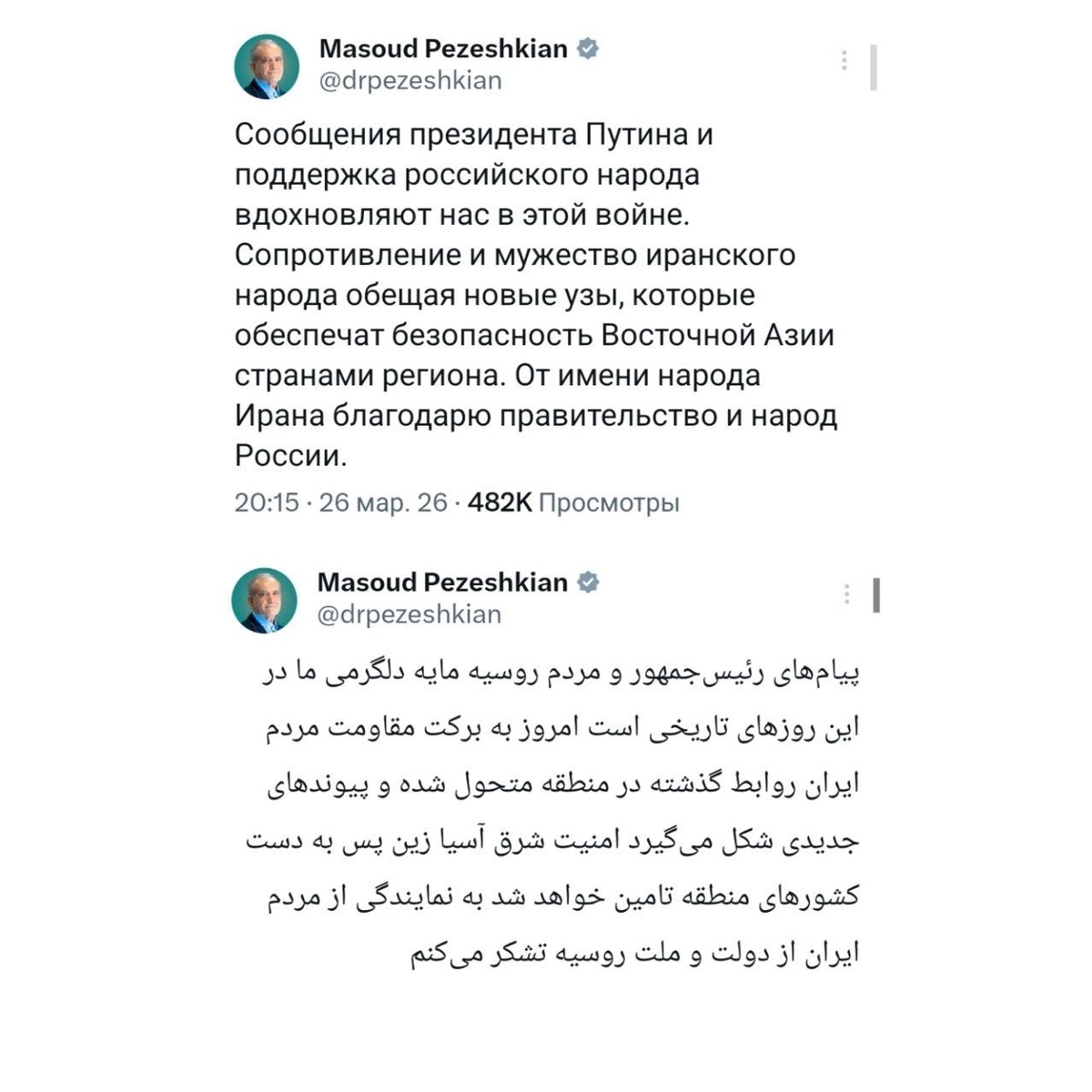 🇷🇺🇮🇷Президент Ирана поблагодарил правительство и народ России за их поддержку на русском языке в своем официальном аккаунте в соцсети X.