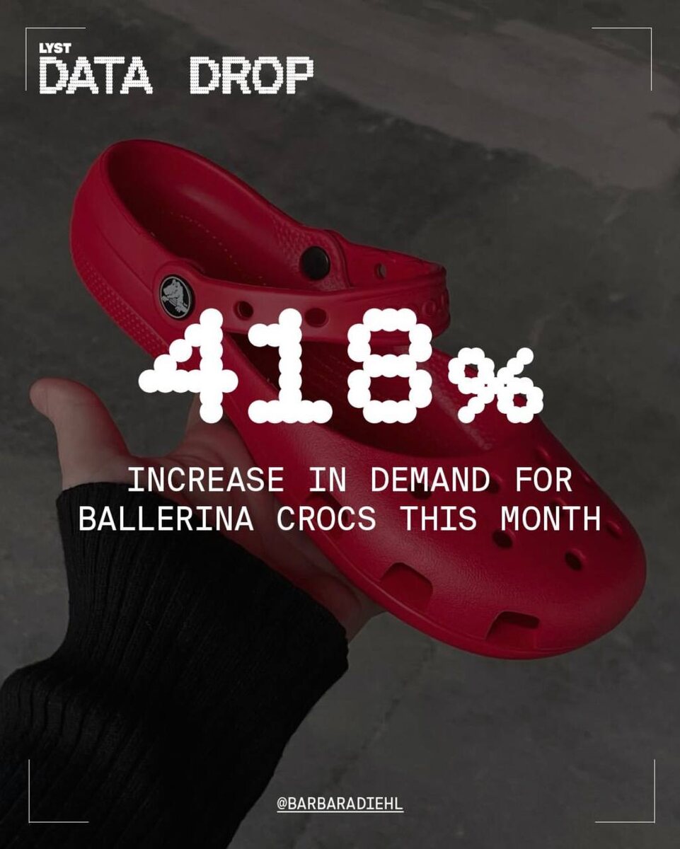Кандидат на самую популярную обувь этого лета — балетки Crocs. Тут Lyst зафиксировал, что запросы на них подскочили на 418% за месяц. Хотя сам тренд на балет уже прекратил свой бурный рост, но вот комфортная (и бюджетная!) версия — пожалуйста.