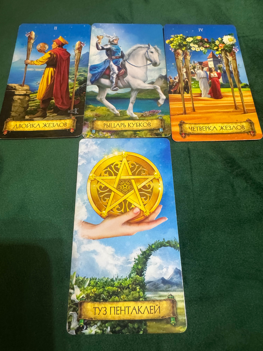 Первые три карты — Двойка Жезлов, Рыцарь Кубков и Четверка Жезлов — это мощнейший утвердительный ответ. Энергия встречи уже запущена, и она набирает обороты прямо сейчас.