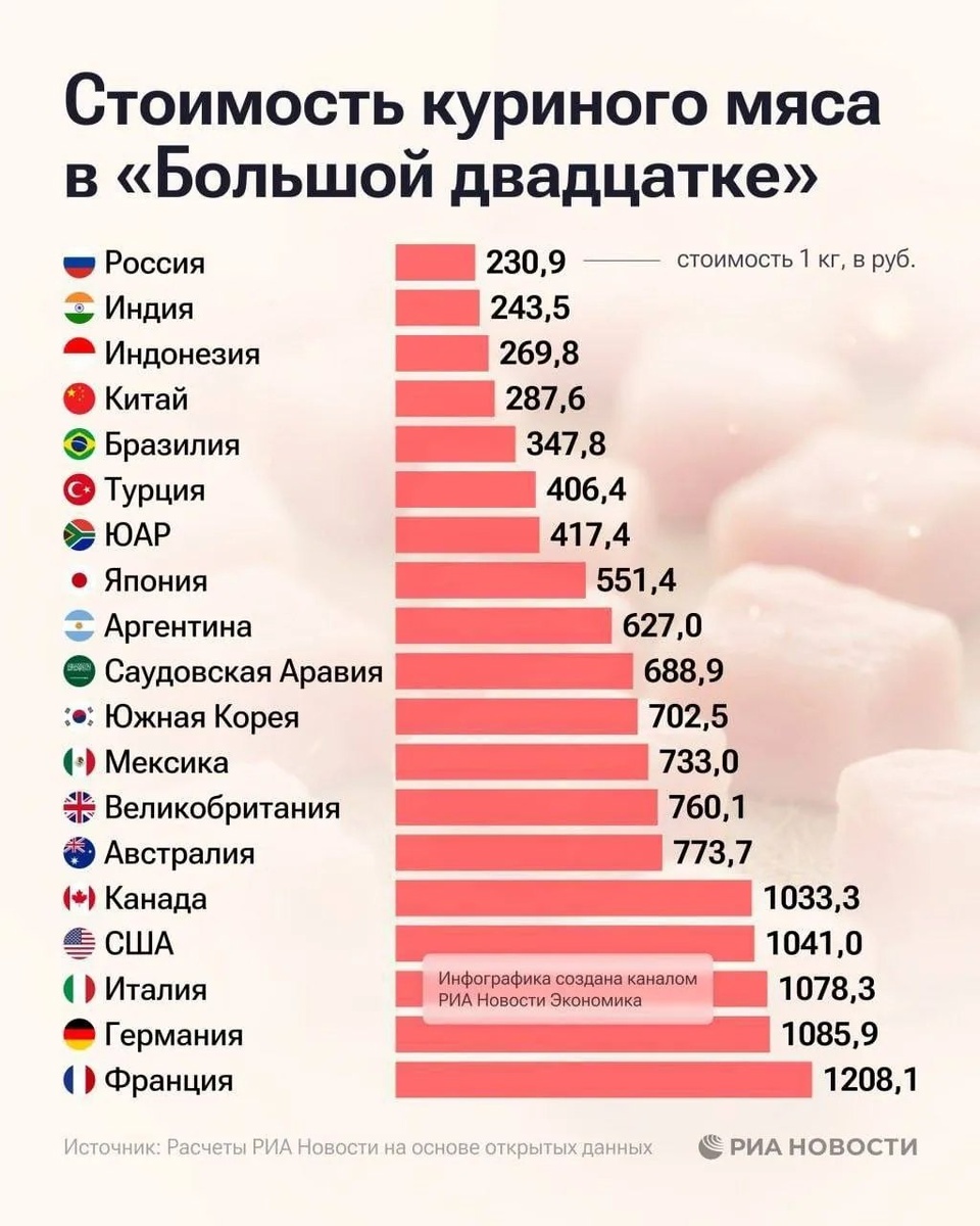 Россия заняла первое место в рейтинге стран G20 по доступности куриного мяса. Цена на продукт в России составляет 230 рублей за кг, что на 30% ниже средней по «Большой двадцатке». Анализ причин и прогнозы экспертов. Среди ключевых решений и фактов: Россия заняла первое место в рейтинге стран G20 по доступности куриного мяса с ценой 230 рублей за кг; Средняя стоимость куриного мяса в странах G20 превышает 320 рублей за килограмм; Эксперты связывают снижение цен с ростом отечественного производства и снижением импортных пошлин; Спрос на куриное мясо в России вырос на 12% в первом квартале 2026 года. Читать полностью