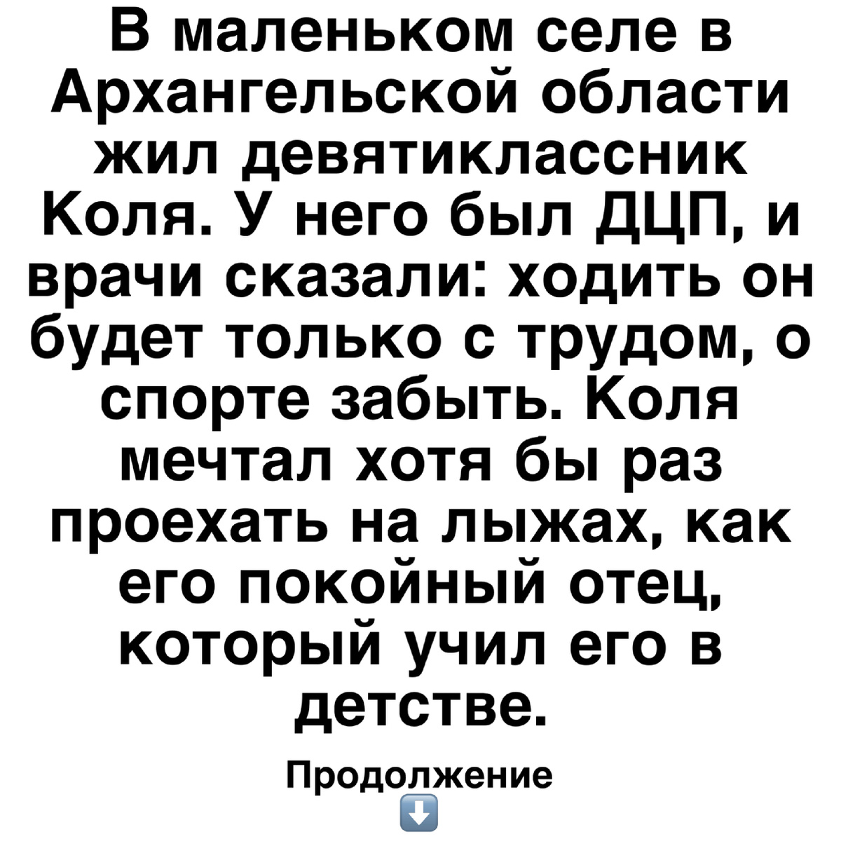 В маленьком селе в Архангельской области жил девятиклассник Коля. У него был ДЦП, и врачи сказали: ходить он будет только с трудом, о спорте забыть. Коля мечтал хотя бы раз проехать на лыжах, как его покойный отец, который учил его в детстве.