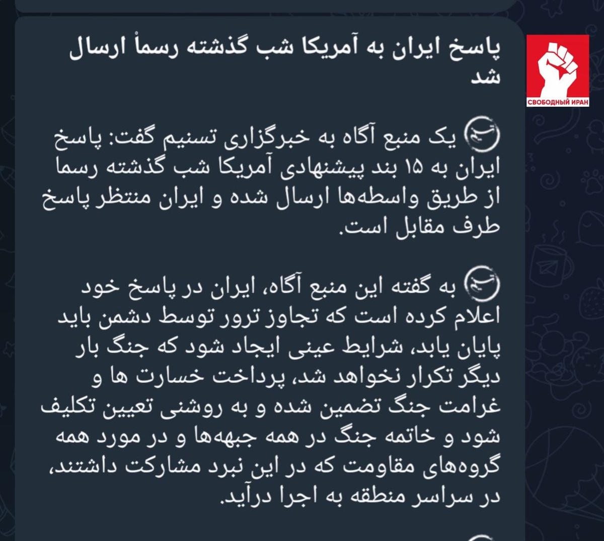 ⚡️ Tasnim сообщает, что Иран минувшей ночью через посредников отправил официальный ответ на 15-пунктное предложение США и выдвинул свои условия: прекращение атак, реальные гарантии от новой войны, военные компенсации и остановка боевых действий по всему региону. Теперь мяч на стороне Вашингтона. Подпишитесь на канал