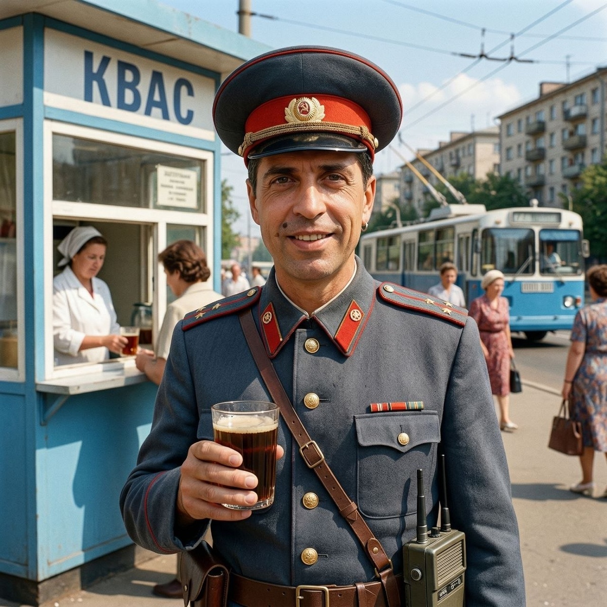 От подписчика @Androklesss Используй прикреплëнное фото человека как референс - перенеси внешность этого человека точь-в-точь, сохраняя черты лица, форму головы, цвет волос, глаз, кожи и все уникальные особенности. Полу‑крупный уличный портрет мужчины 40–50 лет со светлой кожей; лёгкая дружелюбная улыбка, взгляд в камеру. Форменная фуражка с красным околышем и золотистой кокардой; тёмно‑сине‑серый китель милиционера образца 1980‑х с красным кантом, латунными пуговицами, погонами и небольшими планками наград; коричневая портупея с кобурой, на ремне портативная рация. В правой руке советский прозрачный граненый стеклянный стакан с тёмным квасом. Слева в кадре киоск в стиле 1980-х годов по продаже кваса, на ней надпись кириллицей "КВАС" и продавщицей в белом халате. Фон — летний советский городской пейзаж: сине‑белый троллейбус с токоприёмниками и контактной сетью, панельные жилые дома, несколько прохожих; яркий солнечный полдень, мягкие естественные тени, тёплая палитра кожи. Композиция