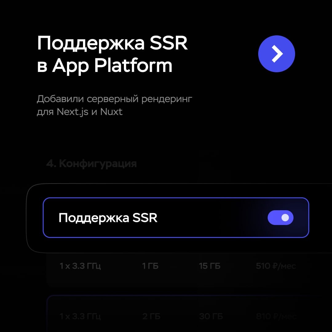 ⚡️ Раньше можно было запускать только статику (SSG) и одностраничные приложения (SPA). К ним добавился и серверный рендеринг (SSR). SSR — это когда страница собирается на сервере и сразу приходит пользователю готовой. Например, в интернет-магазине вы сразу увидите товары и цены без пустого экрана и долгой загрузки. Что дает этот режим: +1 к гибкости разработки. В приложении можно использовать серверную логику, авторизацию и собственные API-обработчики. +1 к SEO. Страницы рендерятся на сервере → лучше индексируются и быстрее попадают в выдачу. +1 к простоте архитектуры. Не нужно создавать отдельный бэкенд, ведь часть логики можно держать в SSR. Как включить: при создании просто активируйте SSR — приложение развернется как бэкенд, где можно выбрать конфигурацию сервера и задать команду запуска. Минимальный конфиг: от 510 ₽/мес с 1 CPU и 1 ГБ RAM ☝🏻 После деплоя режим изменить нельзя. Для других настроек создайте новое приложение. Запустить SSR на своем проекте →