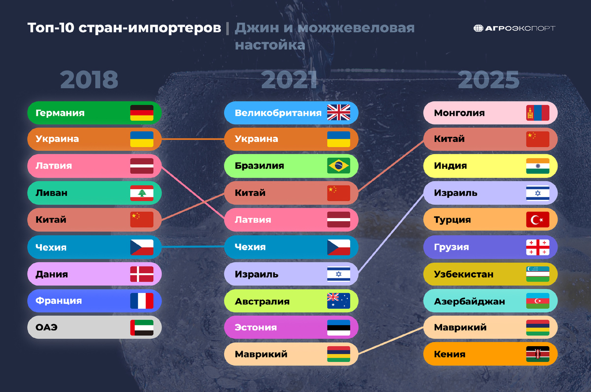 В 2025 году Россия экспортировала более 58 тыс. тонн спиртных напитков (за исключением вина и пива) на сумму более 93 млн долл. США. В сравнении с 2024 годом отгрузки выросли на 15% в натуральном выражении и 39% — в стоимостном. В том числе за прошлый год Россия поставила на зарубежные рынки около 800 тонн джина и можжевеловой настойки на сумму более 2 млн долл. США. За период с 2022 года это максимальный показатель как в объеме, так и в деньгах. При этом интересно, меняются ли направления поставок, открываются ли новые страны для экспорта или расширяются отгрузки на уже проверенные рынки? Ответить на эти вопросы мы постараемся сегодня. Итак, на графике представлены: 🔵 Основные страны-импортеры джина и можжевеловой настойки из России в натуральном выражении; 🔵 Самые динамично растущие рынки; 🔵 Новые перспективные направления экспорта. За 2 месяца 2026 года (без учета стран ЕАЭС) Россия экспортировала более 40 тонн джина и можжевеловой настойки на сумму около 140 тыс. долл. США.