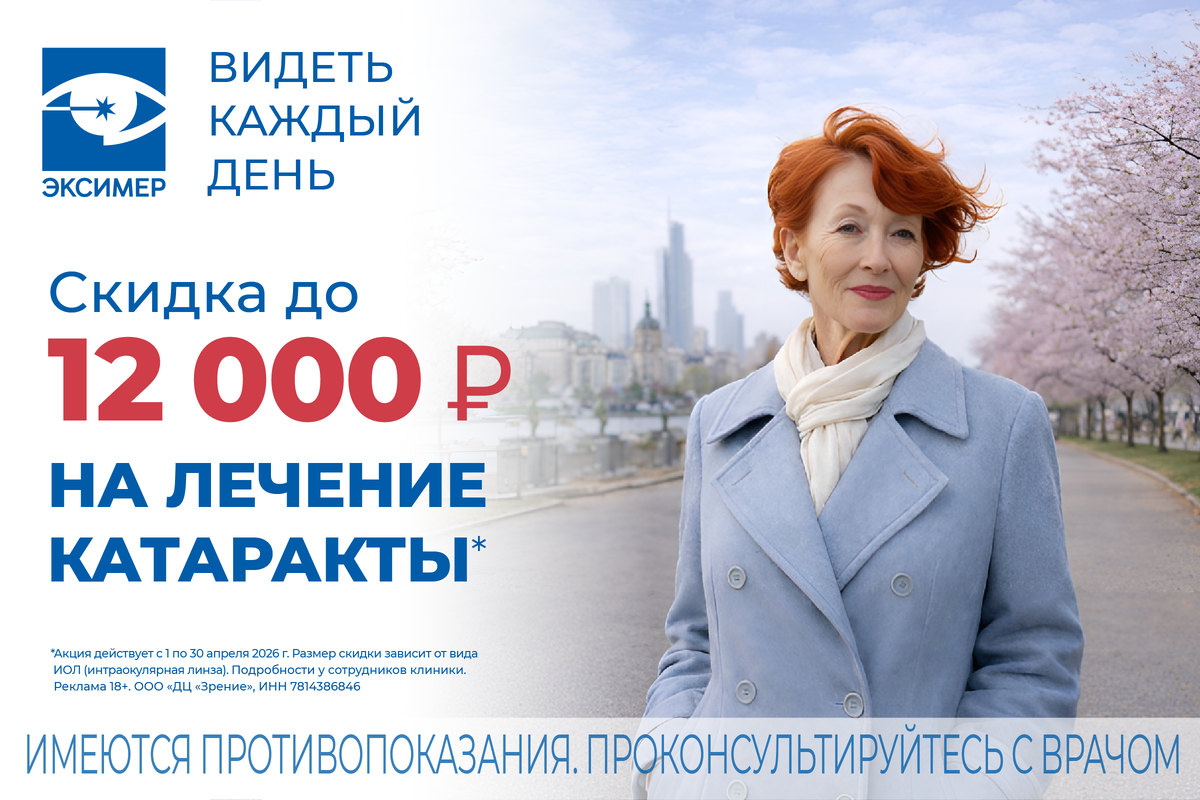 Хотите вернуть зрению чёткость и забыть о катаракте? У вас есть прекрасная возможность сделать это с выгодой. Только с 1 по 30 апреля 2026 года в клиниках «Эксимер» действует специальное предложение: Скидка до 12 000 рублей на лечение катаракты. Размер скидки зависит от вида ИОЛ (интраокулярной линзы). Опытный офтальмолог поможет подобрать оптимальный вариант линзы, подходящий именно вам. Операция по замене хрусталика проводится в режиме одного дня — вам не придётся ложиться в стационар. Не откладывайте заботу о зрении. Верните себе ясность и комфорт уже сегодня! Подробности уточняйте у сотрудников клиник «Эксимер».