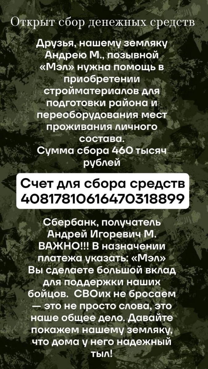 https://vk.ru/wall32440796_11223 ❗️❗️❗️Друзья, к нам обратился наш земляк Андрей М., позывной «Мэл» — боец, который с момента объявления мобилизации в сентябре 2022 года и сейчас находится на передовой. Ситуация на фронте меняется быстро, и для дальнейшего успешного и своевременного выполнения боевых задач в специальной военной операции, у его батальона возникла острая потребность в предоставлении стройматериалов для подготовки района и переоборудования мест проживания личного состава. Как вы можете помочь? Мы открываем сбор денежных средств и обращаемся к неравнодушным жителям нашего района и руководителям предприятий. 🖇️Сумма сбора 460 тысяч рублей Счет для сбора средств 40817810616470318899 Сбербанк, получатель Андрей Игоревич М. ВАЖНО!!! В назначении платежа указать: «Мэл» Вы сделаете большой вклад для поддержки наших бойцов🙏🏼 Сделайте репост этого поста — возможно, именно среди ваших знакомых есть человек, готовый помочь. Важен каждый рубль. СВОих не бросаем — это не прост