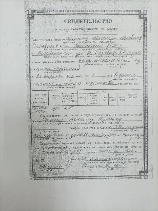 Дело в том, что со стороны ответчика — военного комиссара Новокуйбышевска Михаила Дёмина неожиданно появилось «свидетельство о праве собственности на землю», датируемое началом 90-х годов. Документ, который ранее в деле не фигурировал, был представлен в виде обычной ксерокопии, при этом оригинал, по словам представителя, утрачен Сам факт появления такого документа вызывает целый ряд вопросов. Во-первых, на предыдущих заседаниях он не предъявлялся, а причиной его отсутствия, как утверждает сторона ответчика, стало банальное «забыли». Во-вторых, даже после его обнаружения оригинал так и не представлен суду. То есть речь идет исключительно о копии, происхождение которой остается неясным. При этом каких-либо дополнительных архивных подтверждений, дубликатов или регистрационных записей, которые могли бы подтвердить подлинность свидетельства, также не представлено 🤔 Согласно содержанию документа, земельный участок якобы был предоставлен Дёмина еще в 1992 году. Однако эти сведения вступают