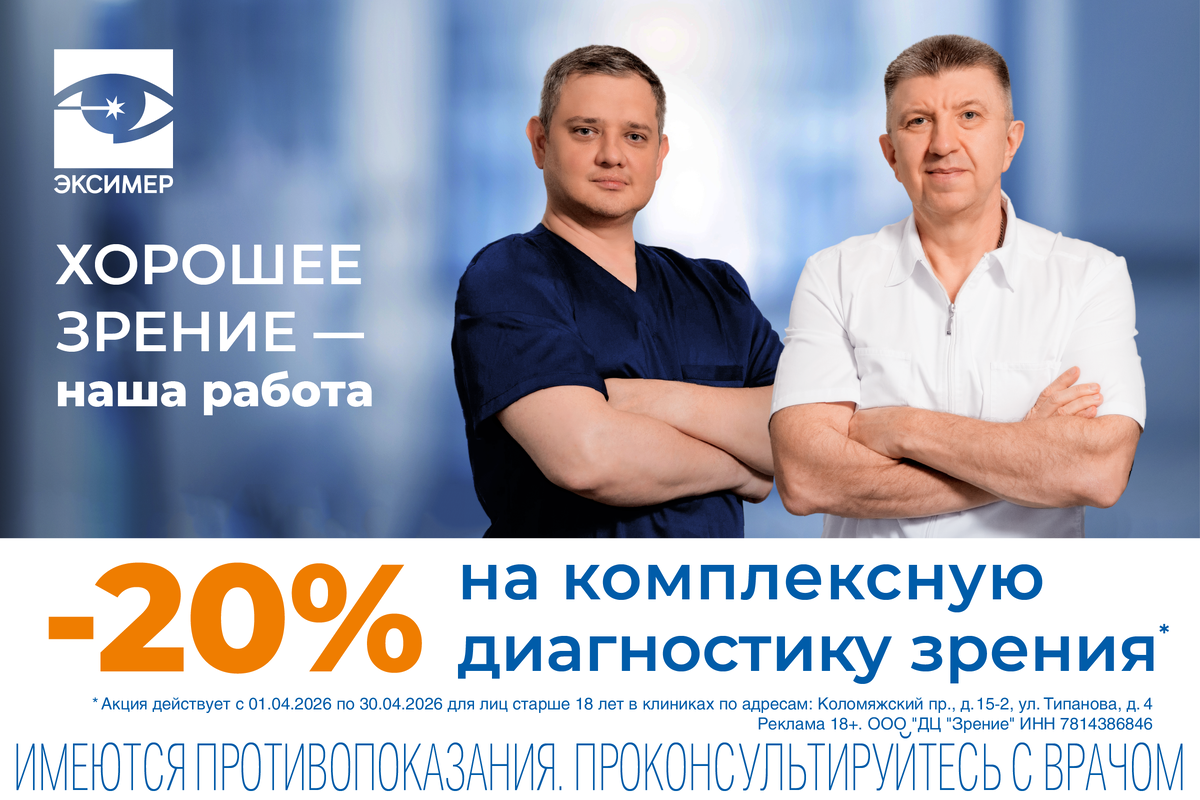 Забота о глазах начинается с точного обследования. В клиниках «Эксимер» проверка зрения проходит легко и комфортно, а сейчас на неё действует специальное предложение. С 1 по 30 апреля 2026 года скидка на комплексную диагностику зрения — 20% в клиниках по адресам: Обследование проводят опытные офтальмологи на современном оборудовании — всё для того, чтобы вы чувствовали себя уверенно и спокойно. Не упустите возможность проверить зрение с заботой и выгодой! Предложение действует для пациентов старше 18 лет. Подробности уточняйте у сотрудников клиник «Эксимер».