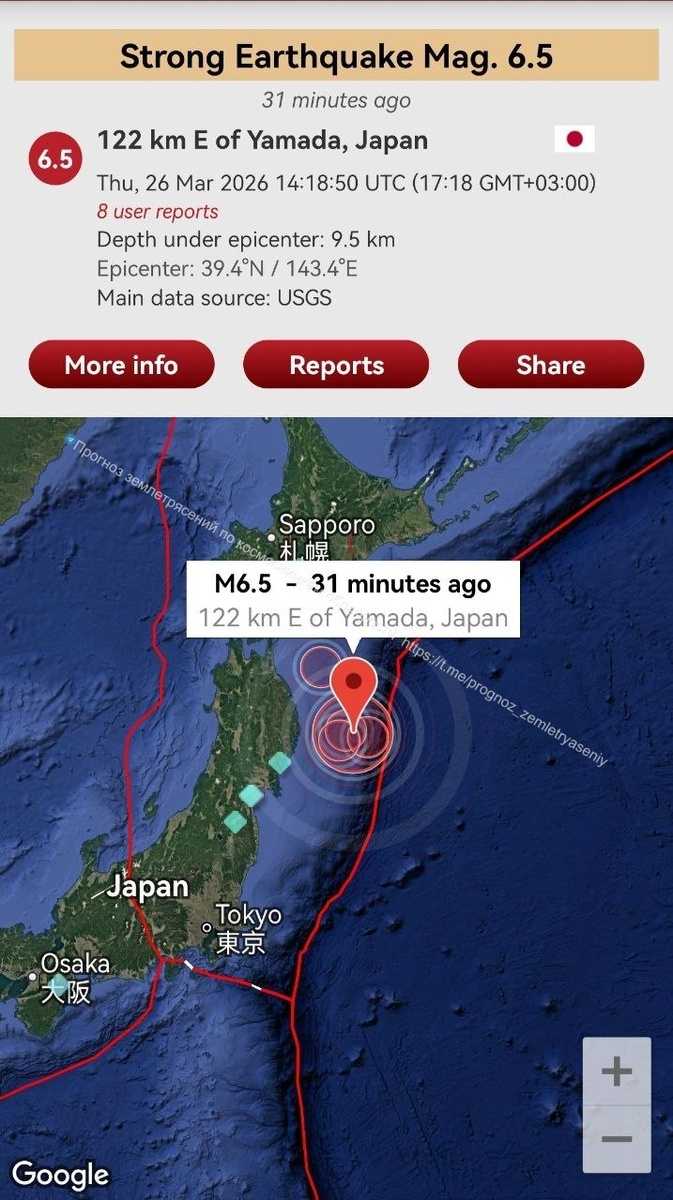 Согласно предупреждению от 22 марта произошло сильное землетрясение М6.5 у Японии по обозначенной зоне. До М7 магнитуда события не дотянула. Спасибо и на этом 🙏 Проигрались вчерашняя аномалия в VLF и сегодняшний зашкал по ЭМФ в Томске. ===== According to the warning dated March 22, a strong earthquake M6.5 occurred near Japan in a designated area. The magnitude of the event did not reach M7. Thanks for that.