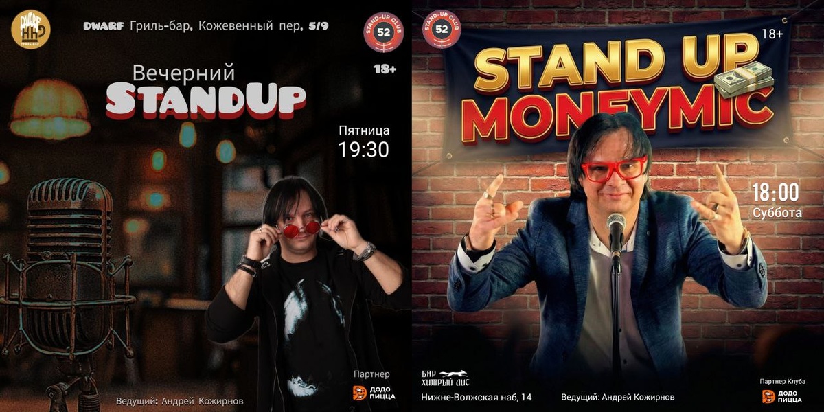 +): 🎤 Вечерний StandUp 27 марта (пт), 19:30 DWARF Гриль-бар, Кожевенный пер., 5/9 Билеты по ссылке. 👉 Выступают Резиденты Нижегородского стендап клуба. Это вечер юмора и хорошего настроения! Что может быть лучше?! Приходи, кайфуй и смейся! Стендап - это жизнь, боль и умение посмеяться над самим собой. Для связи: +7 (930) 292-77-55 🎤 StandUp MoneyMic. Битва за деньги 28 марта (сб), 18:00 Бар Хитрый Лис, Нижне-Волжская наб., 14. Билеты по ссылке 👉 Выступают крутые стендап-комики, участники Ютуб и ТВ-проектов с лучшими шутками, а самые смешные - забирают деньги и призы. Зрители решают кто лучший! Приходи, кайфуй, отдыхай и голосуй за своего фаворита! ❗️❗️❗️ Среди зрителей на каждом мероприятии разыгрываем сертификат на большую пиццу. Правила в группе организатора в ВК. Мы делаем комедию. Соц сети и мессенджеры: https://taplink.cc/standupclub52, подписывайся