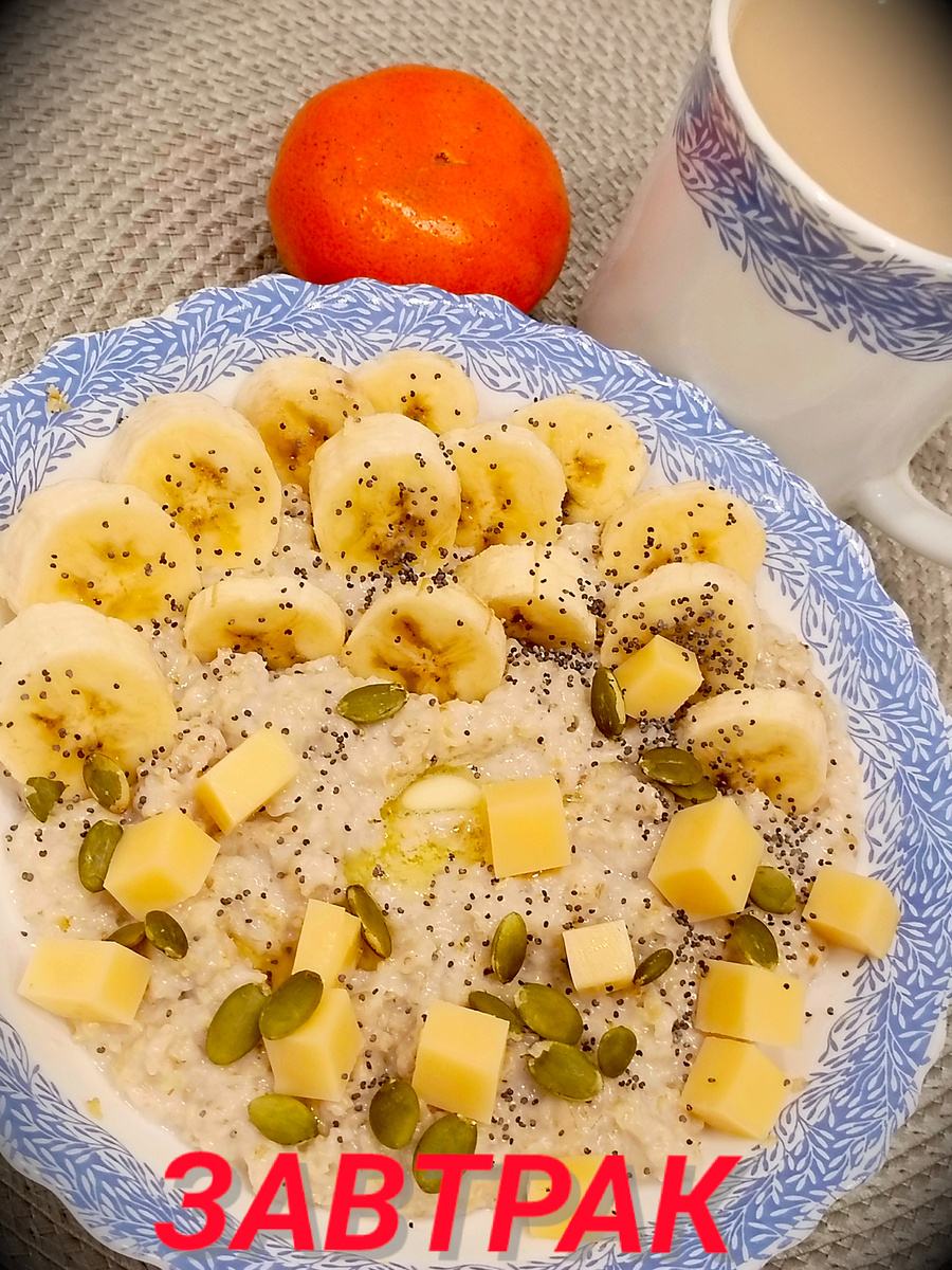 Мое утро началось с любимой каши – отрубяши, с бананом, сыром, маслом, тыквенными семечками и маком. А еще кофе с молоком и мандаринка.