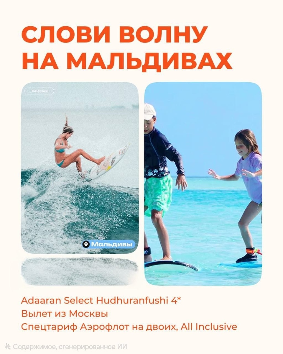 🏄♂️ 🌊 Май - это один из самых комфортных месяцев для сёрфинга на Мальдивах: тёплая вода, регулярные свеллы и рабочие споты на разных уровнях 🌴 🏝 Где сёрфить? 🏄♀️ Kuda Villingili Resort Maldives 5* - близко спот Chickens. Отель, который выбирает для сёрфинга Тимати 🏄♀️ Cinnamon Dhonveli Maldives 4* - спот Pasta Point у острова 🏄♀️ Adaaran Select Hudhuranfushi 4* - доступ к Pasta Point 🏄♀️ Ayada Maldives 5* Deluxe - споты южных атоллов 🏄♀️ Anantara Dhigu Maldives Resort 5* Deluxe - выезды на споты 🏄♀️ Six Senses Kanuhura 5* - серфинг с трансфером 🏄♀️ Four Seasons Kuda Huraa 5* - серф-школа и доступ к спотам 🏄♀️ Niyama Private Islands Maldives 5* - спот Vodi у острова ✨ Adaaran Select Hudhuranfushi 4* ✈️ Вылет из Москвы в мае на 7 ночей| Спецтариф Аэрофлот 👫 на двоих, All Inclusive 💸 478 000 ₽ Сёрфинг - это незабываемые эмоции и драйв, которые хочется повторить. Ты ловишь волну, чувствуешь движение воды и полностью переключаешь свой фокус внимания на настоящий