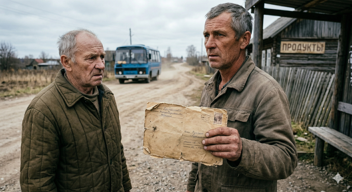 Остановка на краю посёлка. Конверт в кармане — старый, затёртый по углам.