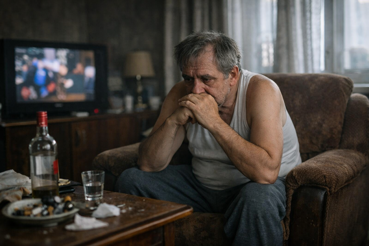 Дверь открыл — и я сразу понял: здесь никто не печёт уже давно. Отец в старых трениках, майка с пятном, волосы торчат в разные стороны. Вмятина на диване такая же глубокая, как в прошлый раз. Он из неё, наверное, только в туалет встаёт.