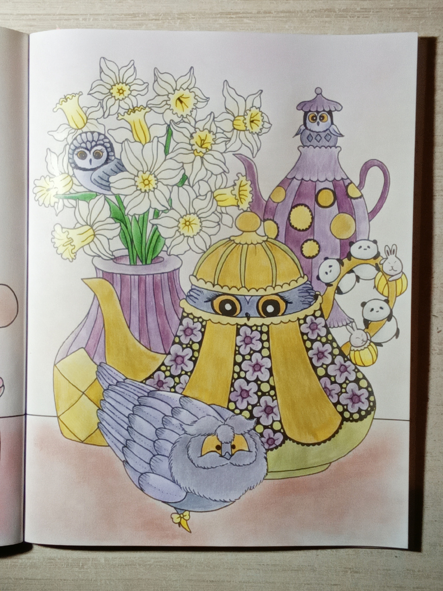 Далее начала раскраску с лягушонком Froggy Days. В ней раскрасила атрибуты художника. У лягушонка есть все что нужно: мольберт, кисти и карандаши, палитра, натюрморт. Здесь тоже тестировала маркеры и фломастеры. Выглядит здорово. В этой книге материалы ложатся хорошо. Получается насыщенно и мило. Красишь и отдыхаешь. То, чего и хотелось.