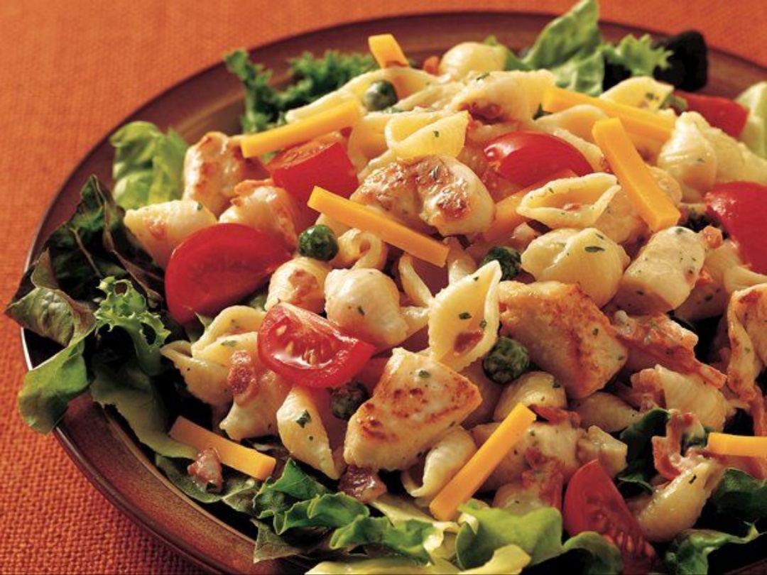 Этот быстрый салат способен заменить полноценный обед или ужин, будучи весьма сытным благодаря входящим в его состав пасте и курице.
