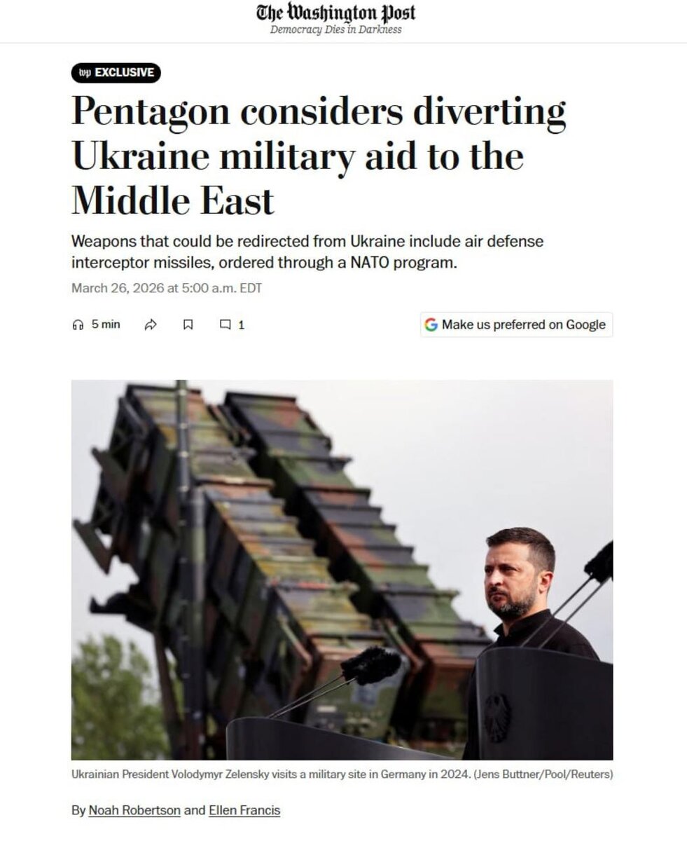 По данным трех источников газеты, предназначенное для Киева оружие может пойти на борьбу с Ираном из-за быстрого расхода боезапасов у США. В оружие, которое могут перенаправить, входят боеприпасы для ПВО, ранее отправленные Украине через программы НАТО. Ну что, сынку, помогли тебе твои америкахи? 👍«БайБайден» в МАХ