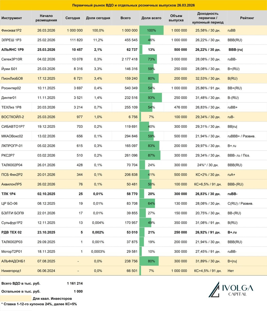 Итоги первичных размещений ВДО и некоторых розничных выпусков на 26 марта 2026 г.