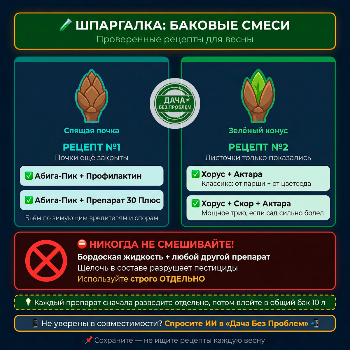 Обработка сада весной - это всегда гонка со временем. Нужно успеть до раскрытия почек, потом по «зеленому конусу», потом перед цветением... Если бегать с опрыскивателем каждый раз отдельно от болезней, отдельно от вредителей, можно жить в саду с ранцем за спиной. Мы в «Дача Без Проблем» ценим ваше время. Зачем делать две работы, если можно сделать одну? Баковая смесь - это коктейль из препаратов, который решает сразу несколько задач за один проход. Но смешивать все подряд нельзя: некоторые лекарства при контакте выпадают в осадок или обжигают листья. Держите проверенные рецепты смесей, которые работают идеально и не вредят растениям. РЕЦЕПТ №1. Самая первая обработка (по спящим почкам). Когда почки еще закрыты, мы бьем по зимующим стадиям вредителей и спорам грибков. ✅ Абига-Пик + Профилактин ✅ Абига-Пик + Препарат 30 Плюс Сначала разводим каждый препарат в небольшом количестве воды, затем вливаем в общий бак с водой (обычно 10 л). РЕЦЕПТ №2. Фаза «Зеленый конус» (почки лопнули). Листо