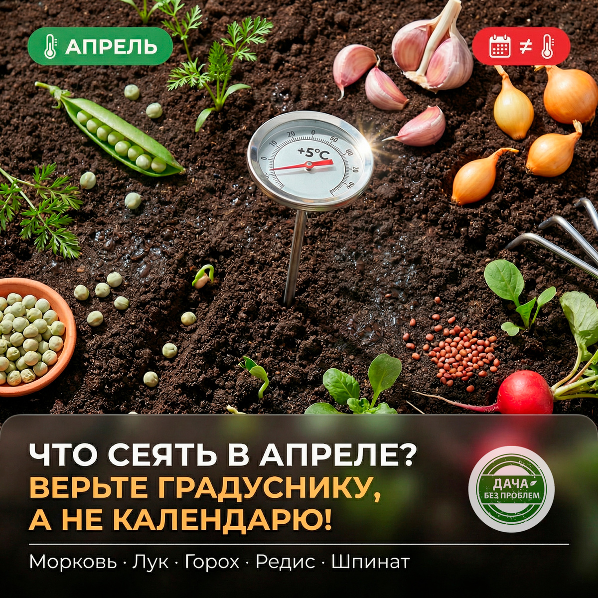 Каждую весну в садовых чатах начинается одно и то же: «а морковку уже можно или рано?», «а свеклу когда?», «а я вчера посеял горох - он замерзнет или нет?». Путаница понятная: апрель обманчив. Днем солнце жарит, а ночью может и минус ударить. Мы собрали все в один текст, чтобы вы не гадали и не бегали с градусником по огороду каждый раз, когда берете семена в руки. Главное правило апреля: холодостойкие - вперед, неженки - ждать. Первыми на грядку отправляются морковь, петрушка и укроп. Им достаточно, чтобы почва прогрелась всего до +3. Даже если ударит мороз до -4, всходы выдержат. Только помните: в семенах моркови много эфирных масел, они мешают воде проникнуть внутрь. Чтобы всходы появились быстрее, промойте семена в горячей воде перед посевом. Вместе с морковью сажаем лук и яровой чеснок. Чем раньше вы воткнете их в сырую холодную землю, тем мощнее будет корневая система до наступления жары. Опоздаете - луковица не нальется. Следом идет зеленая гвардия: салат, шпинат, редис. Им нужн