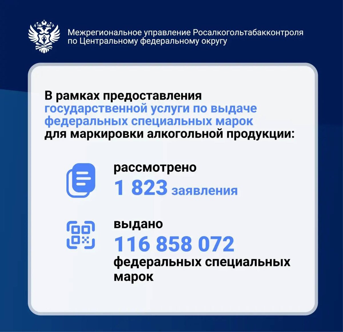 услуги по выдаче федеральных специальных марок для маркировки алкогольной продукции рассмотрено 1 823 заявления и выдано 116 858 072 федеральных специальных марок. 📘 Подробный отчёт о результатах работы Межрегионального управления Росалкогольтабакконтроля по Центральному федеральному округу за февраль 2026 года доступен на сайте. #ЦФО Росалкогольтабакконтроль МАХ | ВКонтакте | Telegram