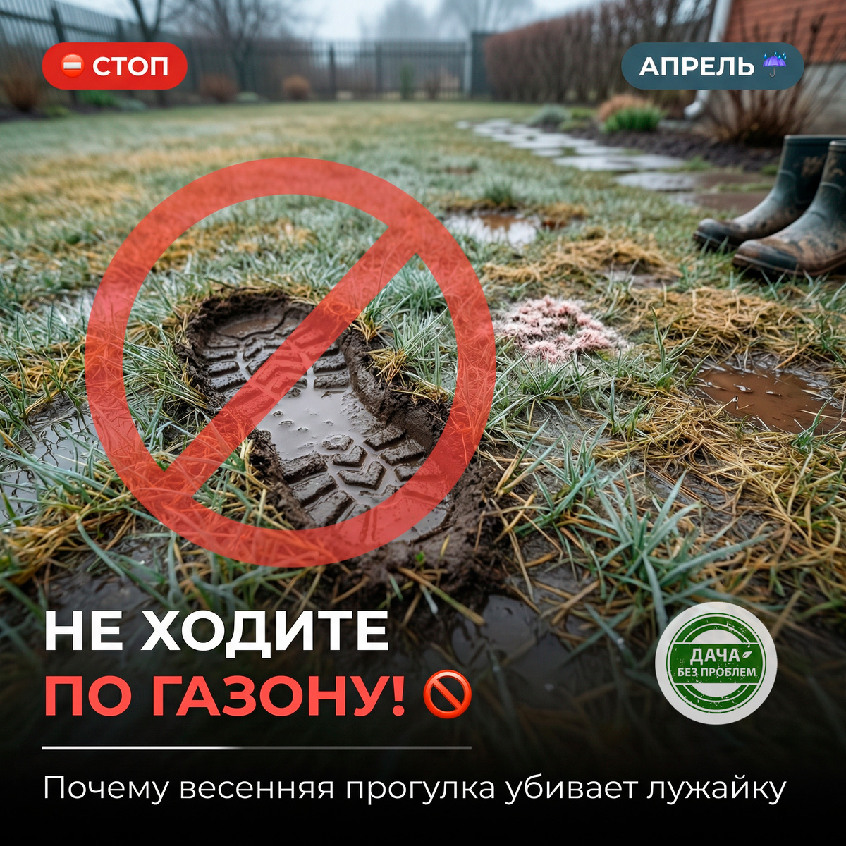 Снег сошел, и так хочется выйти на любимую лужайку с чашкой кофе. Но опытный садовник знает: апрель - самое опасное время для травы. Один неосторожный шаг сейчас может оставить проплешину на все лето. Почему нельзя ходить по мокрому газону? 1. Уплотнение грунта (эффект асфальта). Весной почва насыщена влагой, как губка. Когда вы наступаете на нее, вы выдавливаете воздух и спрессовываете частицы земли. Корневая система травы, которая только просыпается, оказывается замурованной в плотном «пластилине». Без доступа кислорода корни задыхаются и отмирают. В местах ваших следов трава пожелтеет и восстановится очень нескоро. 2. Разрыв дернины. Корни после зимы слабые. Во влажной земле они держатся плохо. Пройдясь по газону, вы буквально вырываете микро-кустики из земли, нарушая целостность травяного ковра. 3. Снежная плесень (розовый налет). Если вы увидели на траве белесые или розоватые пятна, склеенные паутинкой - это фузариоз. Грибок развивается под снегом. Если ходить по больному газону,