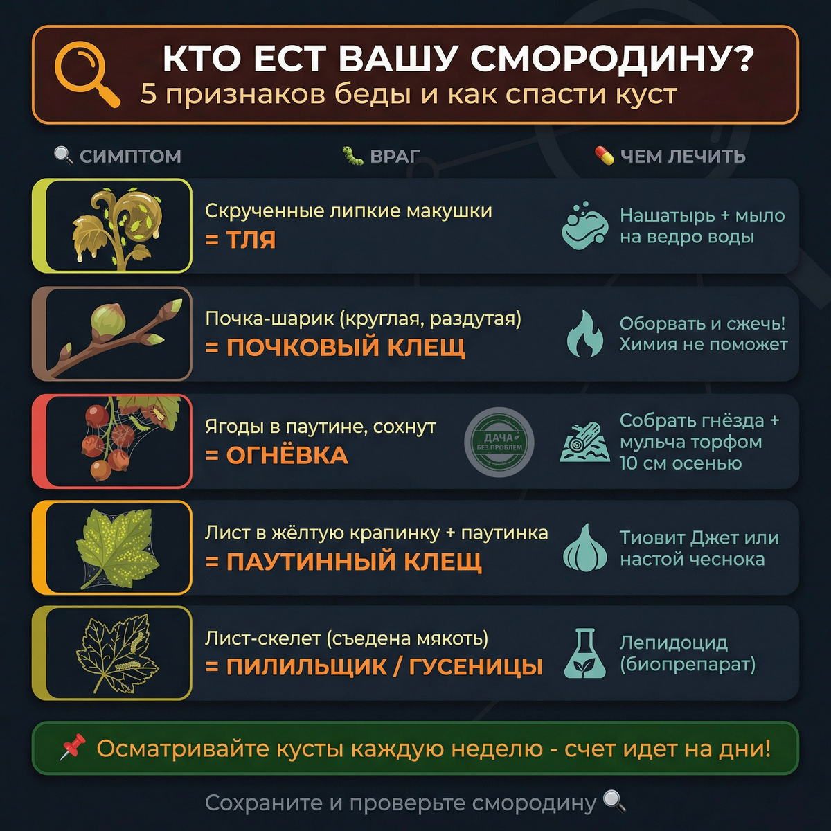 Часто бывает так: ждешь урожая, а ягоды вдруг начинают сохнуть или листья скручиваются. Это работа вредителей. Чтобы не потерять кусты, нужно уметь распознавать врага по первым признакам. Мы составили гид по самым частым симптомам. Проверьте свою смородину прямо сейчас! 1. Скрученные макушки Если молодые листья на верхушках побегов свернулись в комок, стали липкими и блестящими - это тля. Она высасывает соки, и ветка перестает расти. Сделайте "Адский коктейль": 2 ст. ложки нашатырного спирта + 2 ст. ложки жидкого мыла на ведро воды. Опрыскайте вечером. Запах аммиака прогонит тлю моментально. 2. Почки-шарики Весной, когда листвы еще нет, на ветках видны неестественно большие, круглые почки, похожие на маленькие кочанчики капусты. Внутри сидит Почковый клещ. Не жалея, обрывайте эти почки и сжигайте. Если на ветке таких "шариков" много - вырезайте ветку целиком. Никакая химия внутрь плотной почки не проникнет. 3. Ягоды в паутине Ягоды начинают краснеть раньше времени, но при этом они сухи