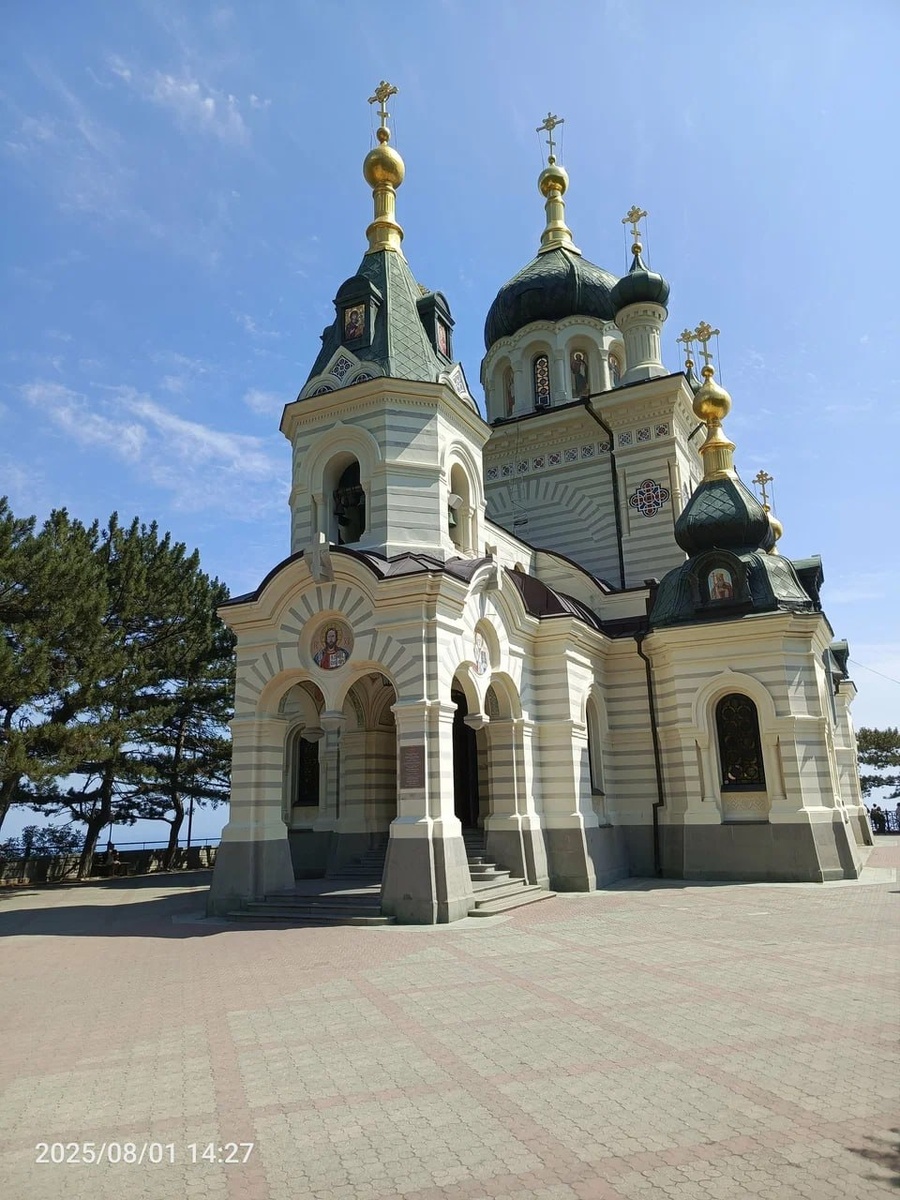 💥 Форосская церковь — православный храм, возведённый в 1892 году на Красной скале: на обрывистом утёсе высотой 412 м над уровнем моря, над курортным поселком Форос. ⛏ Построена по заказу землевладельца Кузнецова в память о чудесном спасении семьи императора Александра III после железнодорожной аварии под Курском. Архитектурный стиль — византийский, тип — крестово‑купольный храм. 🏰 Внешний облик главной церкви Фороса впечатляет: её венчают 9 золочёных куполов с крестами. Стены выполнены в технике византийской кладки из плинфы и отделаны инкерманским белым камнем с резьбой. 💎 Над резным крыльцом главного входа возвышается колокольня с шатровой крышей. Особая деталь — необычное расположение: храм обращён не на восток, как большинство православных церквей, а в сторону моря. 🔥 Внутреннее убранство не уступает внешнему: стены украшены росписями с орнаментами и изображениями святых — среди сюжетов есть Вознесение Христово, Покров Божией Матери, образы четырёх Евангелистов и других свя