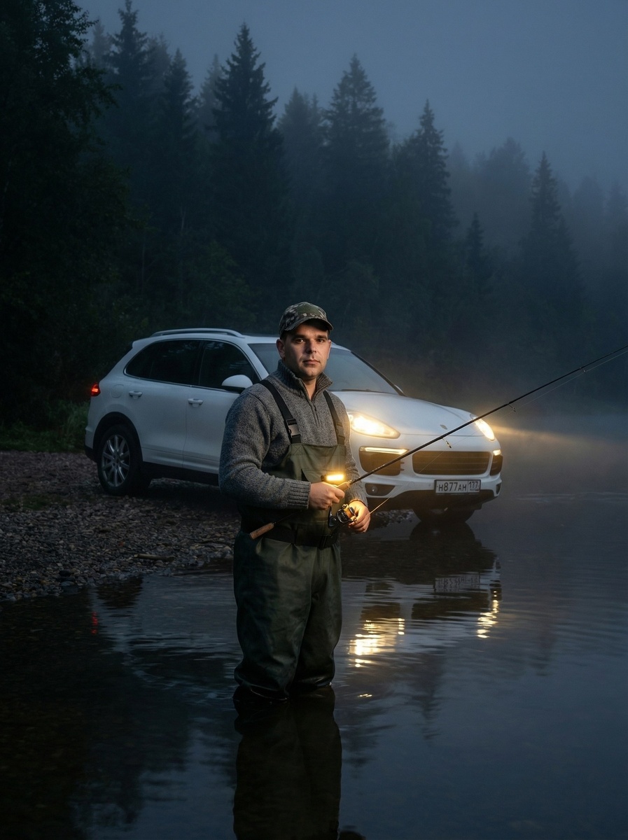 🤖Генерировать можно здесь: 👉БОТ ДЛЯ ГЕНЕРАЦИИ Режим Nano Banana 2/Pro ИНСТРУКЦИЯ Сверхреалистичная кинематографичная фотография, снятая на камеру Hasselblad X2D 100C с объективом 30mm f/3.5. Глубокая глубина резкости, фокус на молодом мужчине. На переднем плане стоит молодой мужчина с загруженного фото по пояс в спокойной воде озера. Черты лица, форма глаз, цвет волос и общий облик мужчины строго перенесены с загруженного референсного фото - точное сходство обязательно, он смотрит прямо в камеру. Он одет в темно-зеленые рыболовные вейдерсы поверх серого шерстяного свитера, на голове у него комуфляжная кепка. В руках он держит спиннинг для джиговой ловли. За его спиной, на галечном берегу, припаркован белый внедорожник Porsche Cayenne с российским номером, его отражение видно в воде. Фон представляет собой темный, густой хвойный лес, окутанный густым ночным туманом, стелющимся над водой. Освещение драматическое и кинематографичное: основной свет исходит от фар автомобиля и небольшого