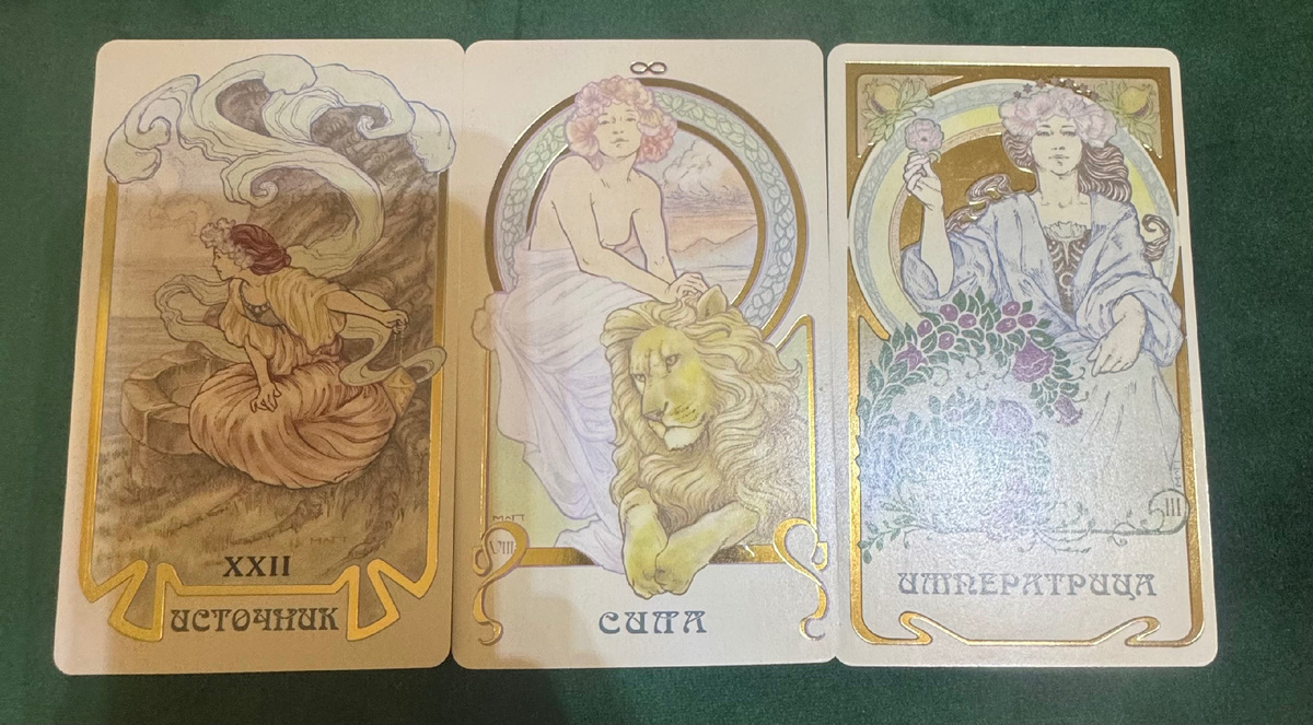 Первые три карты, которые легли на стол, — это Старший Аркан Сила, Императрица и источник. И поверь мне, это не просто случайное сочетание. Это портрет твоей новой реальности, твоей обновленной женской природы.