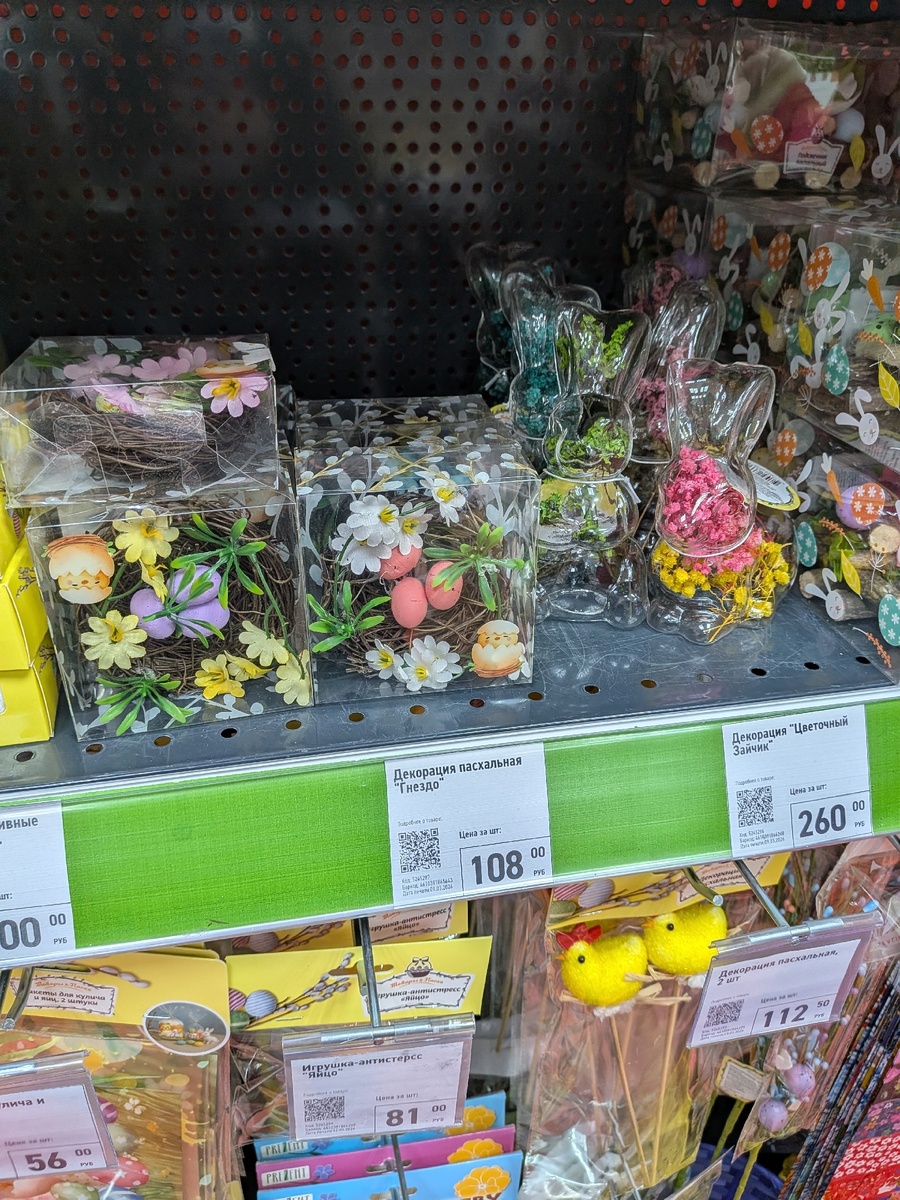 Не мудрено, что полки перед входом заполнены товарами к предстоящему событию, но среди форм для куличей и красок, я бы отметила декоративные новинки. Долго смотрела на эти цветочные композиции, что выполнены в стиле праздника, но, говоря честно, не купила из-за материала. Зайцы с цветами выглядят шикарно, я бы и на цену в 260 рублей закрыла глаза, но они выполнены из боросиликатного стекла, прям как популярные кружки. Учитывая наличие дома двух кошек, не стала ставить такие вещицы на полку, если они упадут, осколки потом собирать будет сложно.
