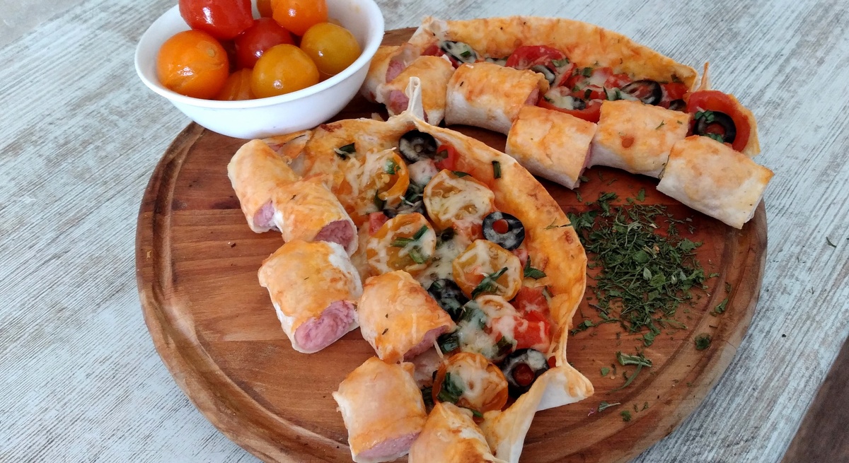 Пиццу в нашем конкурсе готовили многие хозяюшки. Сегодня предлагаю вам пофантазировать на эту тему. Приготовим сет на лаваше по мотивам многими любимой лепешки. Выглядит аппетитно, ароматы пиццы присутствуют. Эту горячую закуску за полчаса запросто приготовит даже самая юная любительница кулинарных эмоций. Разрезаю половину листа лаваша на 2 части. На край выкладываю сосиску. Чтобы она осталась в коконе, край лаваша смазываю смесью муки и воды (1/1). Разрезаю на кусочки по 2 см, однако делать это не обязательно. Оставшуюся часть смазываю томатным соусом, слегка присыпаю натертым сыром и посыпаю травами, у меня сушеные и перемолотые орегано, базилик, мята и петрушка. Сверху укладываю половинки консервированных помидорок и кусочки маслин, добавляю чуток зеленого лука. Сверху еще раз присыпаю сыром. Укладываю мини-лепешки на отдельные куски бумаги для запекания и отправляю в разогретую до 180°C духовку на 15 минут. Достаю. Для большей красивости нарезаю на ломтики. Удобно брать руками, с