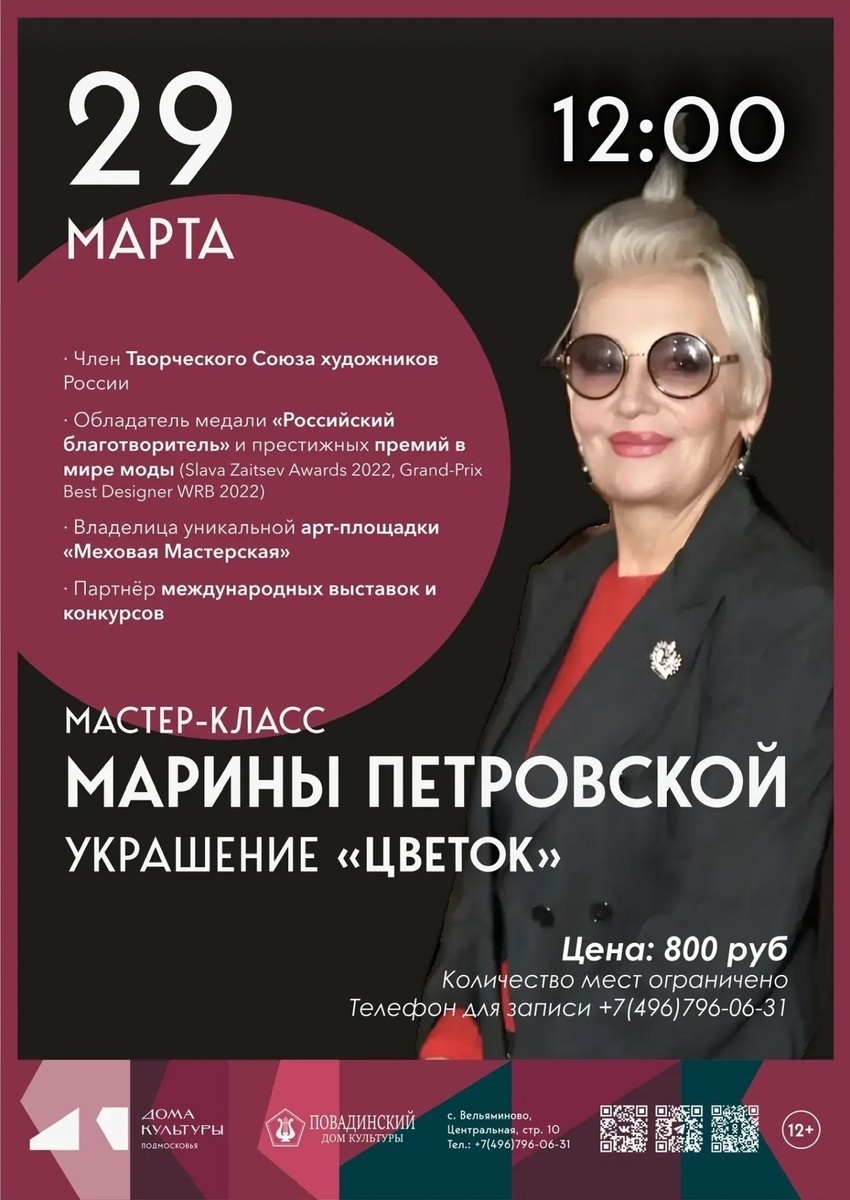 ✨ 🌼В Повадинском сельском Доме культуры состоится уникальное событие — мастер-класс известного модельера Марины Петровской по созданию украшения «Цветок». Участников ждет встреча с профессионалом высокого уровня, являющимся членом Творческого Союза художников России и обладательницей медали «Российский благотворитель». Талант Марины Петровской отмечен престижными премиями в мире моды, включая Slava Zaitsev Awards 2022 и Grand-Prix Best Designer WRB 2022.🌼 🚫 Возраст: 12+ 📆 29.03.2026🕒12:00 🏢 Повадинский сельский дом культуры (СДК) 📍 г.о.Домодедово, с.Вельяминово, 10, Центральная площадь 💰 Цена: 800 ₽ ✅ Мероприятия Домодедово https://dzen.ru/id/66f10385cc4c5a16f7b5fb02 https://vk.ru/domodedovo_events http://dzen.ru/domodedovo_events