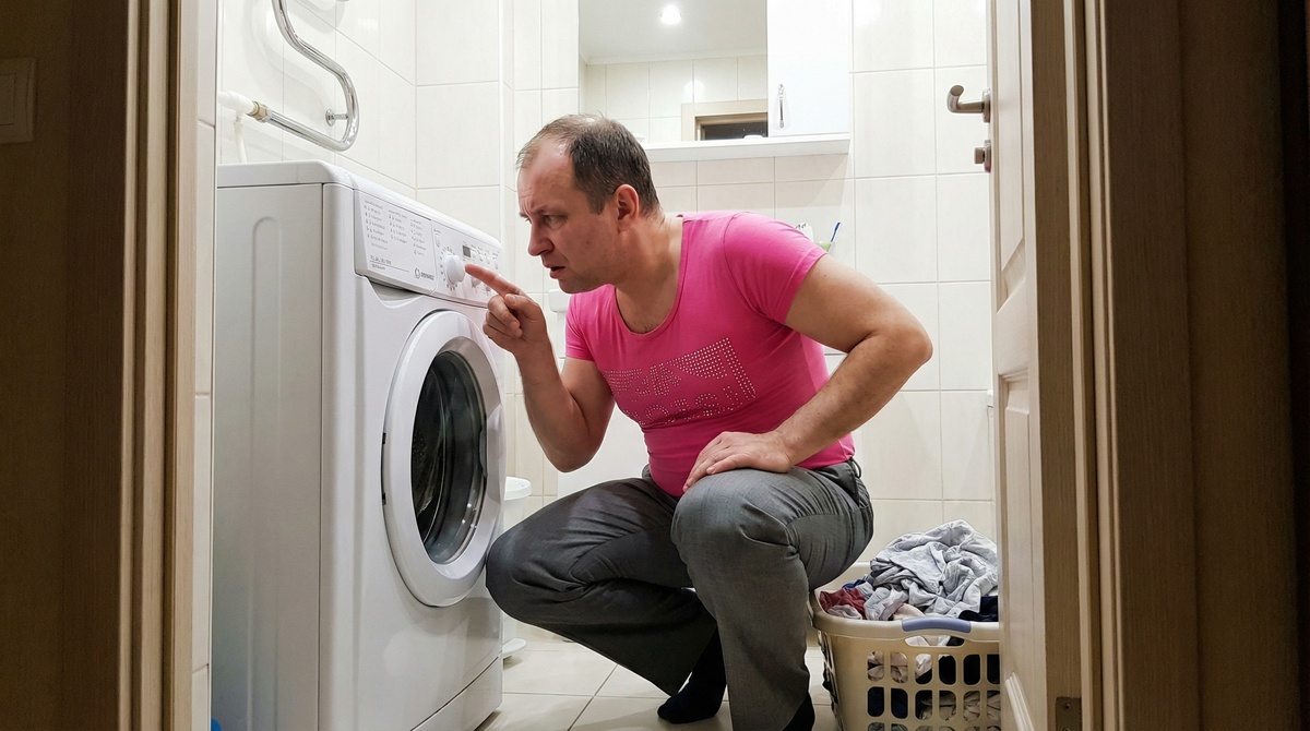 Вадик сидел на корточках перед машинкой. В одних брюках. Внутри уже крутился барабан, полный мужских рубашек и футболок.
