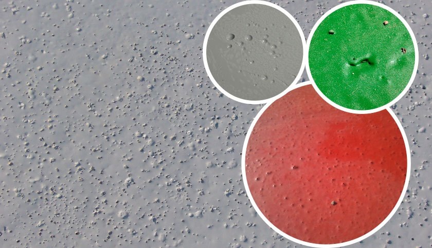 Пленка есть, но вся в мелких дырках. Выглядит как оспина — точечные кратеры, которые пробили покрытие насквозь. Герметичность потеряна, защита под вопросом. Причины! Воздух не смог выйти наружу, застрял и рванул. Взбили. Перемешали краску миксером на бешеных оборотах. Загнали воздух в композицию. Нанесли — пузыри, лопнули — кратеры. Густо и натянуто. Вязкость высокая, поверхностное натяжение тоже. Пленка схватывается коркой, а воздуху снизу выхода нет. Он прорывается там, где слабо. Сушка сверху вниз. Поверхность высохла слишком быстро — кратеры, сиккатив не тот или отвердитель слишком реактивный. Нижние слои еще парят растворителем, а верх уже стоит колом. Пару и воздуху некуда деваться — прорывают корку. Что делать? Мешать с умом, не сушить коркой. Приготовление без фанатизма. Мешать краску спокойно, без аэрации. Если взбили — дать отстояться перед нанесением, чтобы воздух вышел. Вязкость — рабочая, не как сметана. Добавки-деаэраторы и растворители, снижающие поверхностное натяжение,
