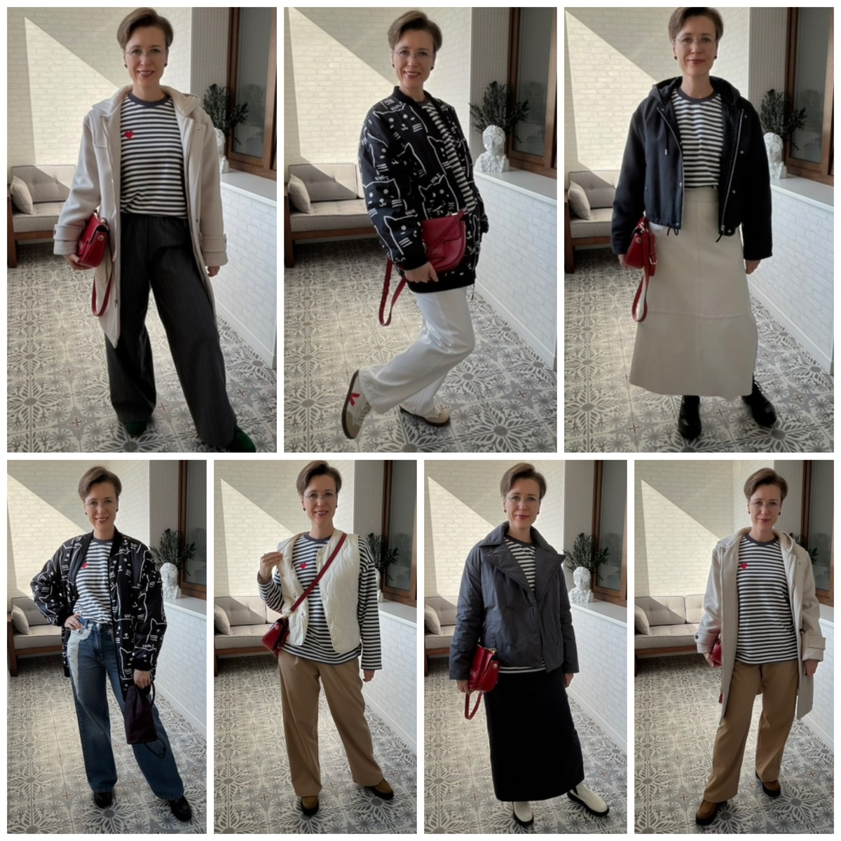 Приветствую вас, дорогие читатели! Купила тельняшку-толстовку в российском бюджетном бренде ТВОЁ, вещь простая, но функциональная. Бело-серая полоска довольно выразительна и подходит к низам любого цвета. Фасон прямой современный. Комфортный состав - 88 % хлопка и петельчатая изнанка, всегда плюс в отличии от изнанки ворсистой, дольше носится не скатывается, подходит для любого сезона. По-быстрому собрала 7 повседневных образов из своих вещей, отлично подходящих для повседневной жизни, а главное - современных и актуальных. 1-й образ с джинсами. Мой любимый ироничный гранж. Милейшие коты и сердечки совместно с драными джинсами и грубыми ботинками. Два стилевых направления гармонично друг друга дополняют. 2-й образ с бежевыми брюками. Красная сумка в большинстве образов не лишняя, цветом поддерживаю наличие вышитого сердечка на толстовке. Брюки и пальто делают образ более собранным в отличие от джинсов, но он остается все таким же комфортным, и с жилетом тоже. 3-й образ с серыми брюками
