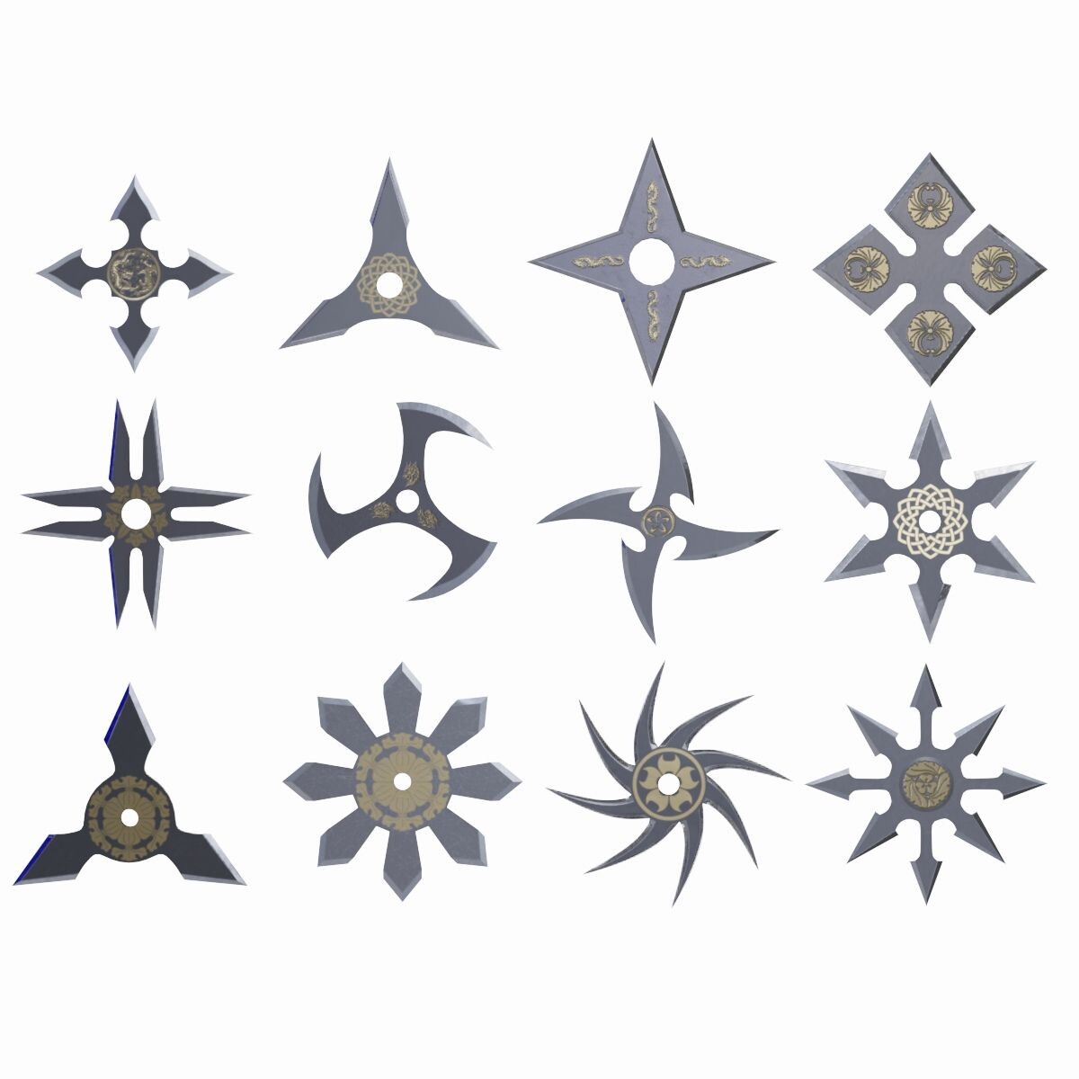 Сюрикэн (Shuriken): Метательное оружие, скрытые клинки, часто в виде «звездочек» (сякэн) или игл (бо-сюрикэн), использовались не столько для убийства, сколько для отвлечения внимания.