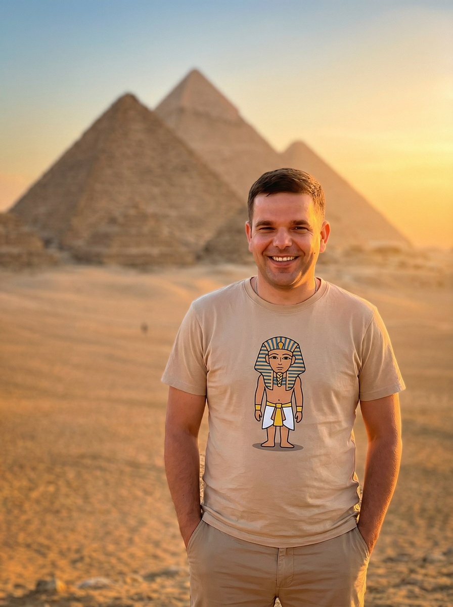 🤖Генерировать можно здесь: 👉БОТ ДЛЯ ГЕНЕРАЦИИ Режим Nano Banana 2/Pro ИНСТРУКЦИЯ Портрет молодого, привлекательного мужчины с короткими темными волосами и дружелюбной улыбкой. Он одет в бежевую футболку с мультяшным принтом древнеегипетского фараона и светло-коричневые брюки. Мужчина стоит, положив руки в карманы, на фоне египетских пирамид Гизы во время заката. Теплый золотистый свет освещает его лицо и создает мягкие тени. Кадр снят с ракурса чуть ниже уровня глаз (low angle shot), что придает ему уверенный вид. Использована малая глубина резкости (f/1.8), благодаря чему фон с пирамидами и пустыней выглядит реалистично, а фокус остается на мужчине. Высокое качество изображения, стиль реалистичной профессиональной фотографии. --ar 3:4. СГЕНЕРИРОВАТЬ 📸 СООБЩЕСТВО 📱