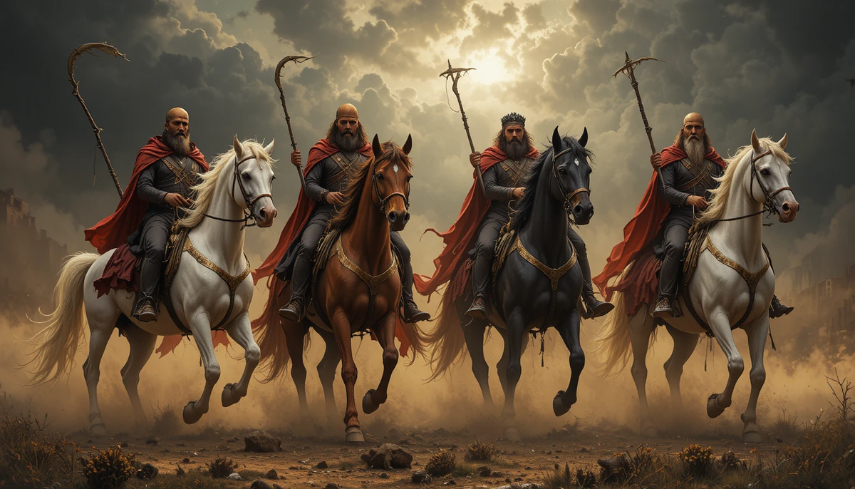 Теперь смотри, что сделал Иоанн Богослов в своей книге «Откровение». Он взял эту же метафору и развернул её в глобальный сценарий конца времён. Он увидел не одного всадника, а четырёх. И они выходят на арену истории в определённой последовательности, чтобы исполнить свои роли.