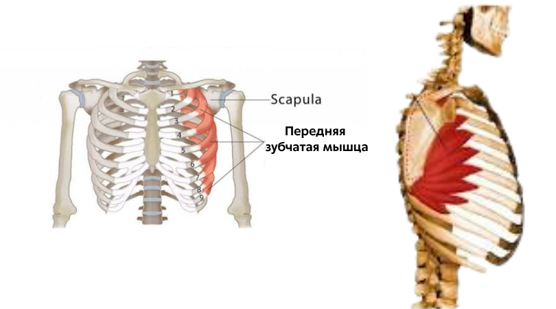 Лопатка — это как платформа, которая должна плотно прилегать к грудной клетке. Передняя зубчатая мышца — притягивает лопатку к рёбрам и не даёт ей отклеиваться.