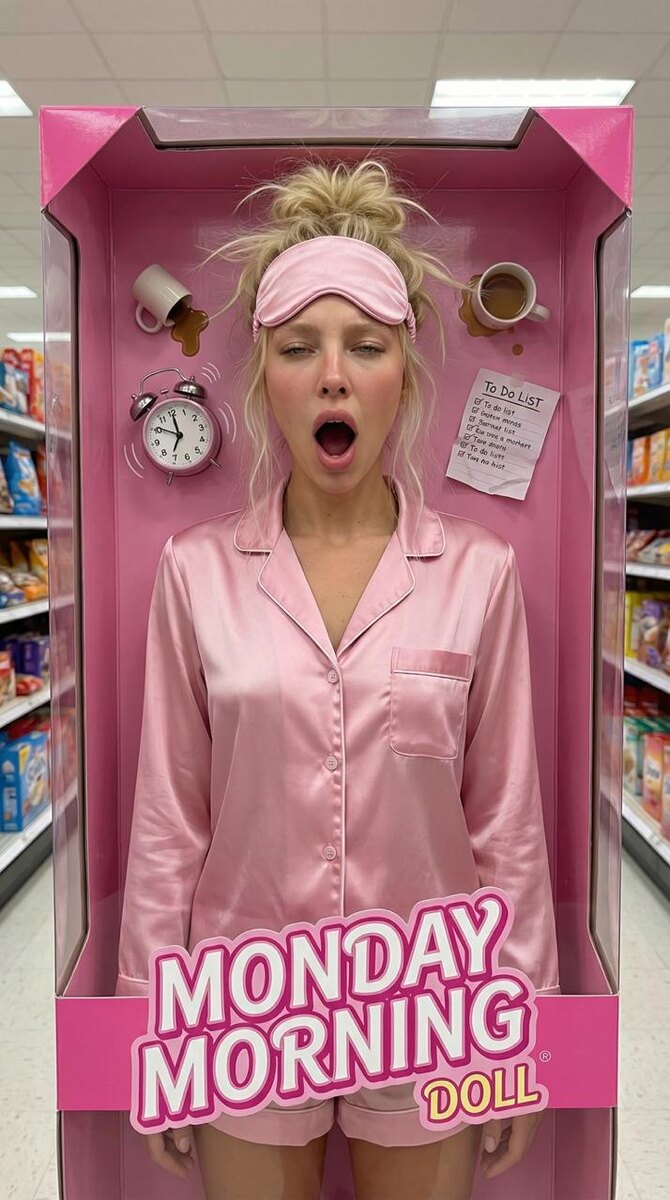 ✨✨✨✨✨✨ ИНСТРУКЦИЯ для генерации такого фото 📸: ✨зайди в бот https://t.me/aibudka_bot ✨ отправь свое фото в бот (лицо чётко видно) ✨ выбери Nano Banana Pro (обязательно ставь ползунок на pro для топ результата 🔛) ✨ параметры: 2K или 4К, 9:16 ✨ скопируй и вставь этот промпт: Сохрани лицо с загруженного фото. Не меняй лицо. Сходство 100%. Сохрани точный цвет глаз и цвет волос модели. Девушка внутри коробки Барби в образе "утро понедельника". Стоит или сидит в сонной позе, глаза полуприкрыты, зевает или смотрит устало. Волосы собраны в НЕБРЕЖНЫЙ MESSY BUN на макушке, торчат пряди. На лбу сдвинутая розовая МАСКА ДЛЯ СНА (sleep mask). Одежда — розовая пижама (шёлковый комплект или футболка с шортами) и пушистые тапочки. В одной руке ОГРОМНАЯ кружка с надписью "But first, coffee" или просто большая розовая кружка. Выражение лица — "я ещё сплю". Макияж — как будто без макияжа, естественный, слегка помятое лицо после сна. Коробка розовая, внутри — спальня, кровать с мятым бельём, будильник
