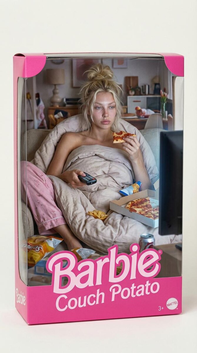 ✨✨✨✨✨✨ ИНСТРУКЦИЯ для генерации такого фото 📸: ✨зайди в бот https://t.me/aibudka_bot ✨ отправь свое фото в бот (лицо чётко видно) ✨ выбери Nano Banana Pro (обязательно ставь ползунок на pro для топ результата 🔛) ✨ параметры: 2K или 4К, 9:16 ✨ скопируй и вставь этот промпт: Сохрани лицо с загруженного фото. Не меняй лицо. Сходство 100%. Сохрани точный цвет глаз и цвет волос модели. Девушка внутри коробки Барби в образе "диванный овощ". Лежит или полулежит в максимально расслабленной позе, ноги вытянуты или закинуты. Закутана в ПЛЕД или одеяло, только голова и руки торчат. Волосы — messy bun или просто растрёпаны, "три дня не мыла". Одежда (под пледом) — мятая пижама или старая футболка. В одной руке ПУЛЬТ от телевизора, в другой — кусок пиццы или чипсы. Рядом открытая коробка пиццы, банка газировки, снэки. Выражение лица — залипающее в экран, расслабленное. Макияж — полное отсутствие. Коробка — выглядит как гостиная: диван, подушки, внутри видно свечение телевизора. Надпись "Barbie