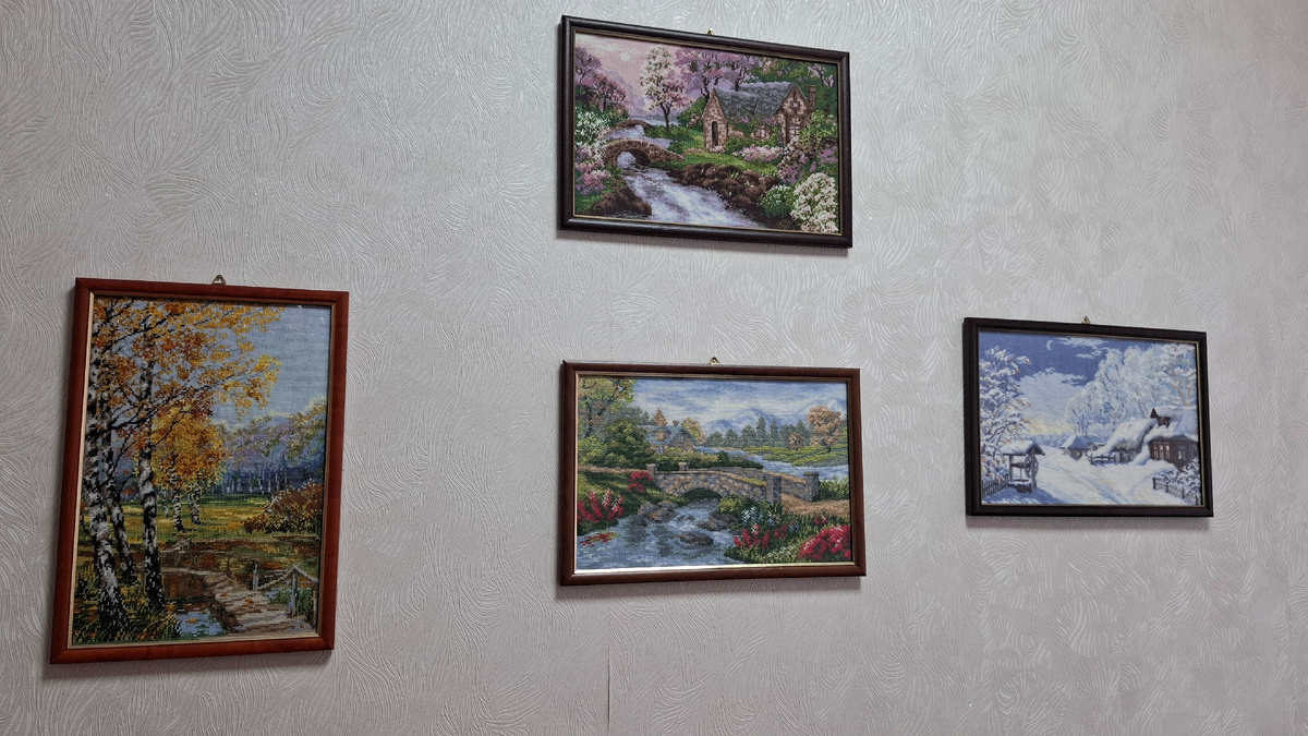 Добрый день, дорогие друзья! Вот уже много лет я работаю в детском саду. Наш детский сад большой, расчитан на 12 разновозрастных групп. Не раз замечала, что в некоторых группах есть небольшие, вышитые крестиком, работы. Висят они в разных местах: в кухонной зоне, в спальне, в уголках природы. Ни воспитатели, ни няни крестиком не вышивают и о том, как в группе появились эти небольшие шедевры не знают. Но нужно отметить, что хранят их бережно и аккуратно. Я прошлась по группам и кабинетам, пофотографировала и хочу показать вам. Начнем с кабинета Заведующего, Ольги Сергеевны. Она конечно вышивает и вышивальный стаж у нее достаточно большой. В ее кабинете одна стена оформлена четырьмя работами по теме «Времена года». Все, наверное, узнали разработки Риолис. Многие из нас вышивали, многим нравятся эти сюжеты. Это самые шикарные вышивки в нашем детском саду. Заглянем в наш кабинет, Музыкальных руководителей. Здесь висит моя первая вышитая работа «Маки» от Чудесной иглы. Помню, вышивала