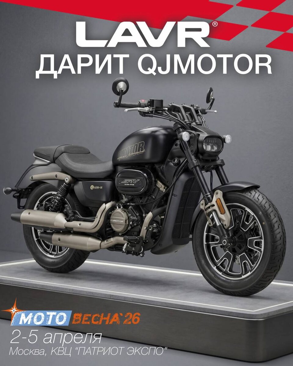 »! Друзья, у нас отличная новость! Наш партнёр — LAVR MOTOLINE — разыгрывает наш легендарный круизёр SRV 350 VS на главном мотособытии весны. Всё просто: 1. Приезжай на Мотовесну в КВЦ «Патриот». 2. Найди стенд LAVR MOTOLINE и пройди квест. 3. Будь на розыгрыше с 3 по 5 апреля — именно там может стать твоим наш QJMOTOR SRV 350 VS. Ждём тебя на стенде LAVR и на стенде QJMOTOR уже со 2 апреля. Участвуй в розыгрыше и забирай ключи от своего мотоцикла! 🔥 #QJMOTOR #SRV350VS #Мотовесна20256 #LAVRMOTOLINE #подарок