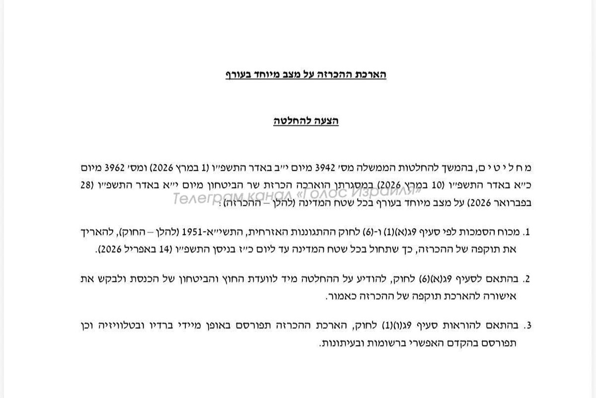 ⚡️Израиль утвердил продление чрезвычайного положения до 14 апреля 2026 г.
