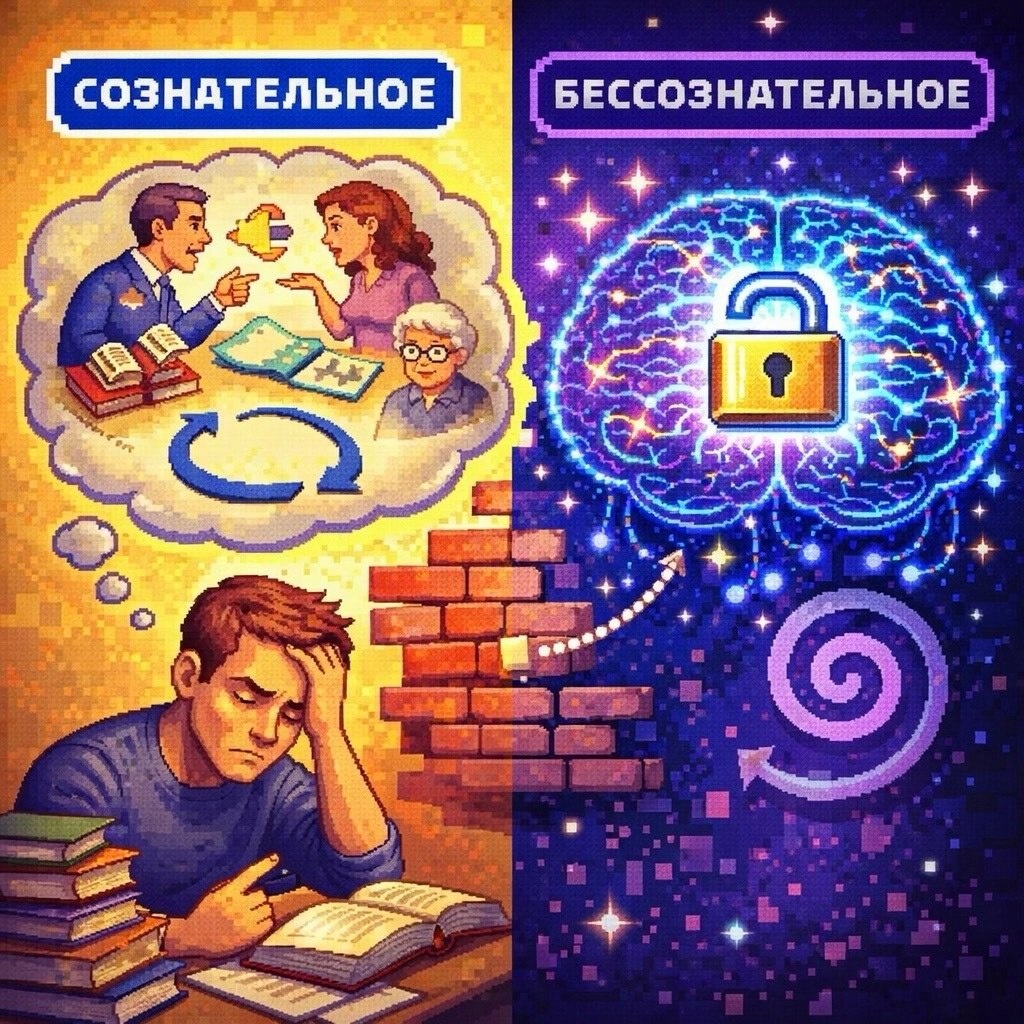 ? Вот есть у человека семейный сценарий повторяющийся. Он в детстве видел, как родители ругаются из-за денег, как отец уходит в себя при конфликтах, как бабушка терпит и молчит. И теперь сам — ругается, уходит, терпит. По кругу 🌀 И он это понимает, он же умный, книжек прочитал, курсов прошёл — не сосчитать. А в этом конкретном месте — стена. Знает откуда что, понимает описания механизмов. А изменить не может, результат не пропорционален усилиям 🧠 Почему? Потому что понимание — это сознание. Сценарий записан не в концепциях из книжек, а в бессознательном и физически внутри головы. Мозг ребёнка увидел, как должно быть — и зафиксировал. И теперь это работает на автомате. Человек не выбирает ругаться из-за денег — просто реагирует. Не выбирает уходить в себя — тело само. Не выбирает терпеть — а по-другому не записано. И вот вопрос — можно ли это изменить разговором? Нет. Поговорить, порассуждать, обменяться мнениями — мозг выслушает, кивнёт, скажет «да-да, надо по-другому». А завтра