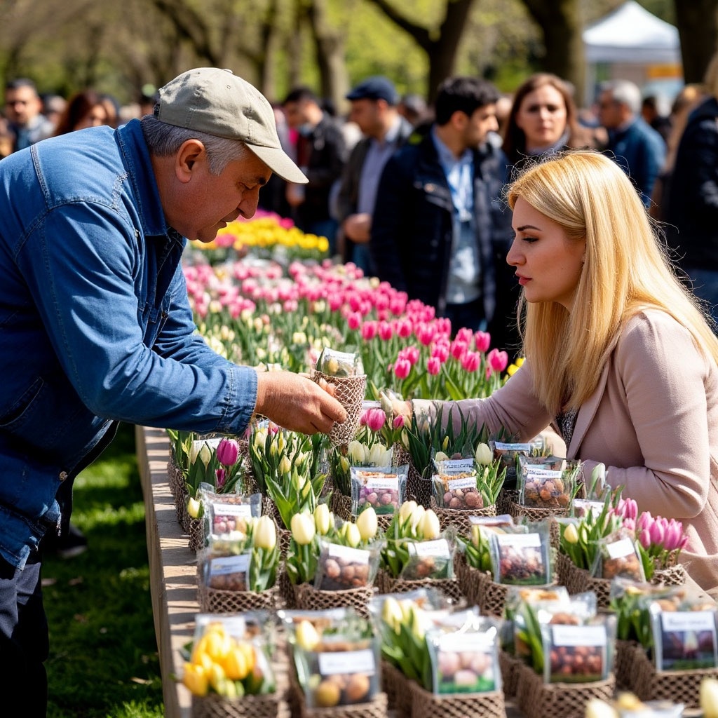 Ярмарка была небольшой, но уютной. Прилавки стояли рядами, на каждом — десятки мешочков с луковицами. Продавцы выкрикивали названия сортов, зазывали покупателей. Я подошла к прилавку, где продавец особенно громко расхваливал свои товары. Он сразу заметил мой интерес. "Хочешь кусочек Стамбула домой?" — спросил он. Я кивнула. Он начал показывать: "Вот этот — "Голландский король", красный, как кровь. Этот — "Апельсинка", ярко-оранжевый. А этот — "Морозное утро", белый с розовым".